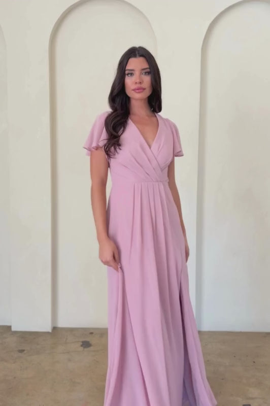 This best-selling chiffon gown boasts an empire waist, playful flowy short sleeves, and a tasteful front slit—perfect for wedding celebrations.