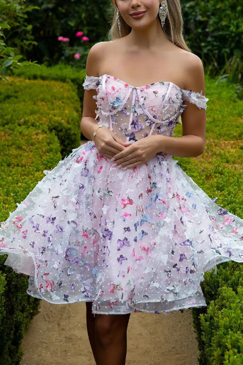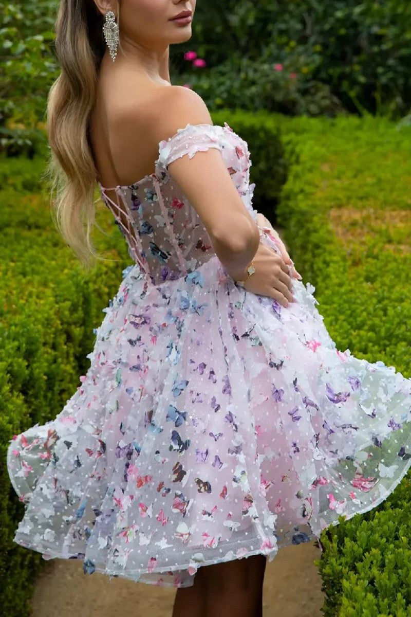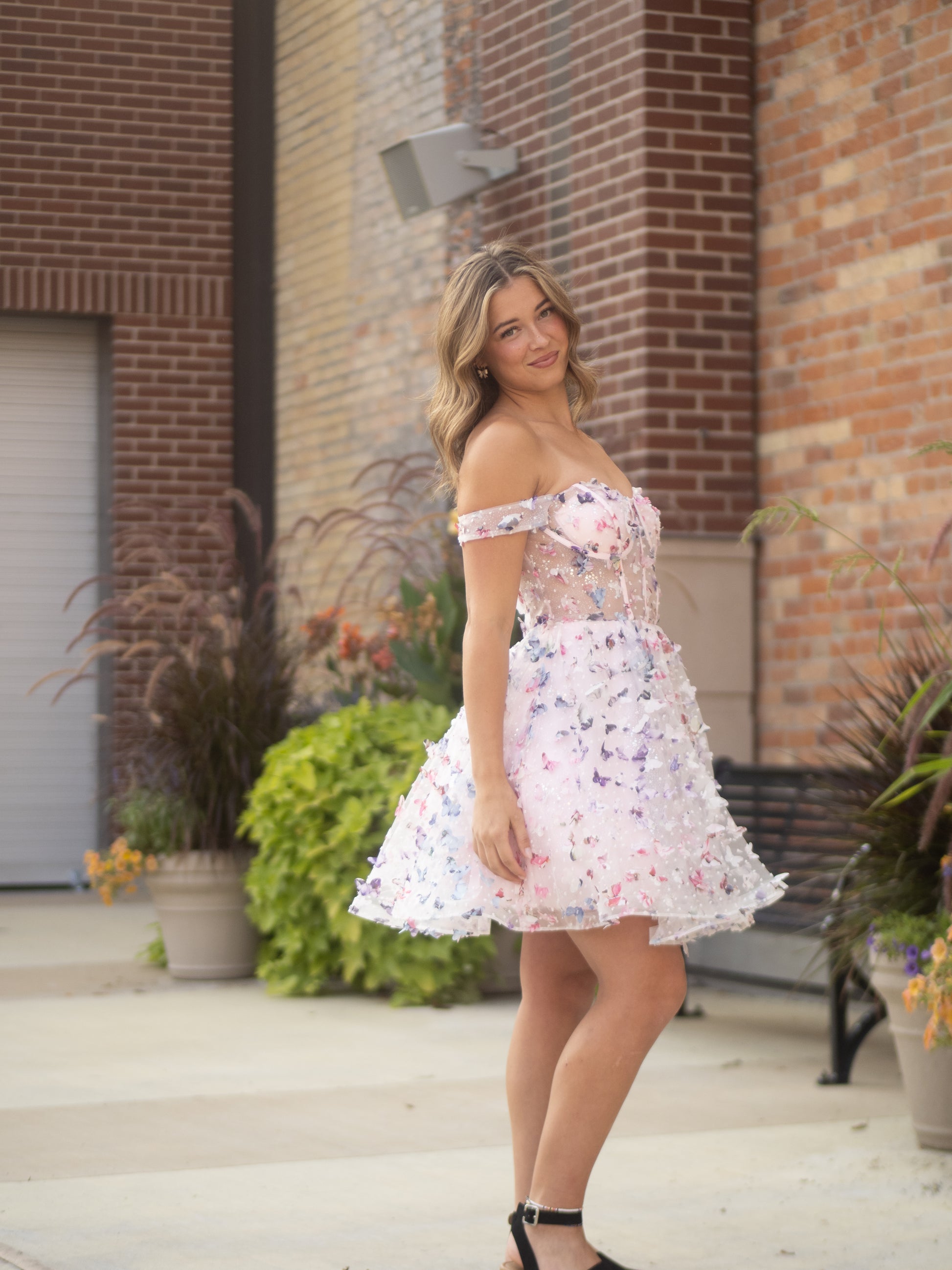 The Aliyah dress features charming 3D butterfly details on lightweight organza. This short A-line style boasts a sweetheart neckline and playful cut-away shoulders, paired with a lace-up back for a perfect fit.