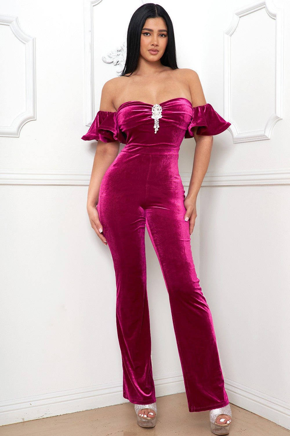 This velvet jumpsuit shines with a rhinestone brooch at the center, featuring an off-the-shoulder ruffle, short sleeves, and pleated details. A zipper at the back and bell-bottom pants complete this fun, flirty look.