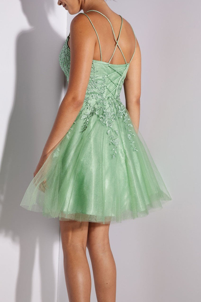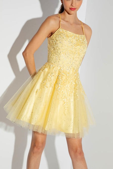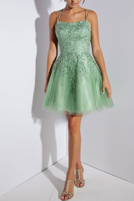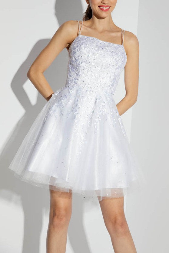 This fun, short A-line dress features a 3D lace embroidered bodice with built-in boning for support, layered over a sparkling mesh underlay. The corset back comes with an optional fabric insert to wear underneath for added comfort and style.