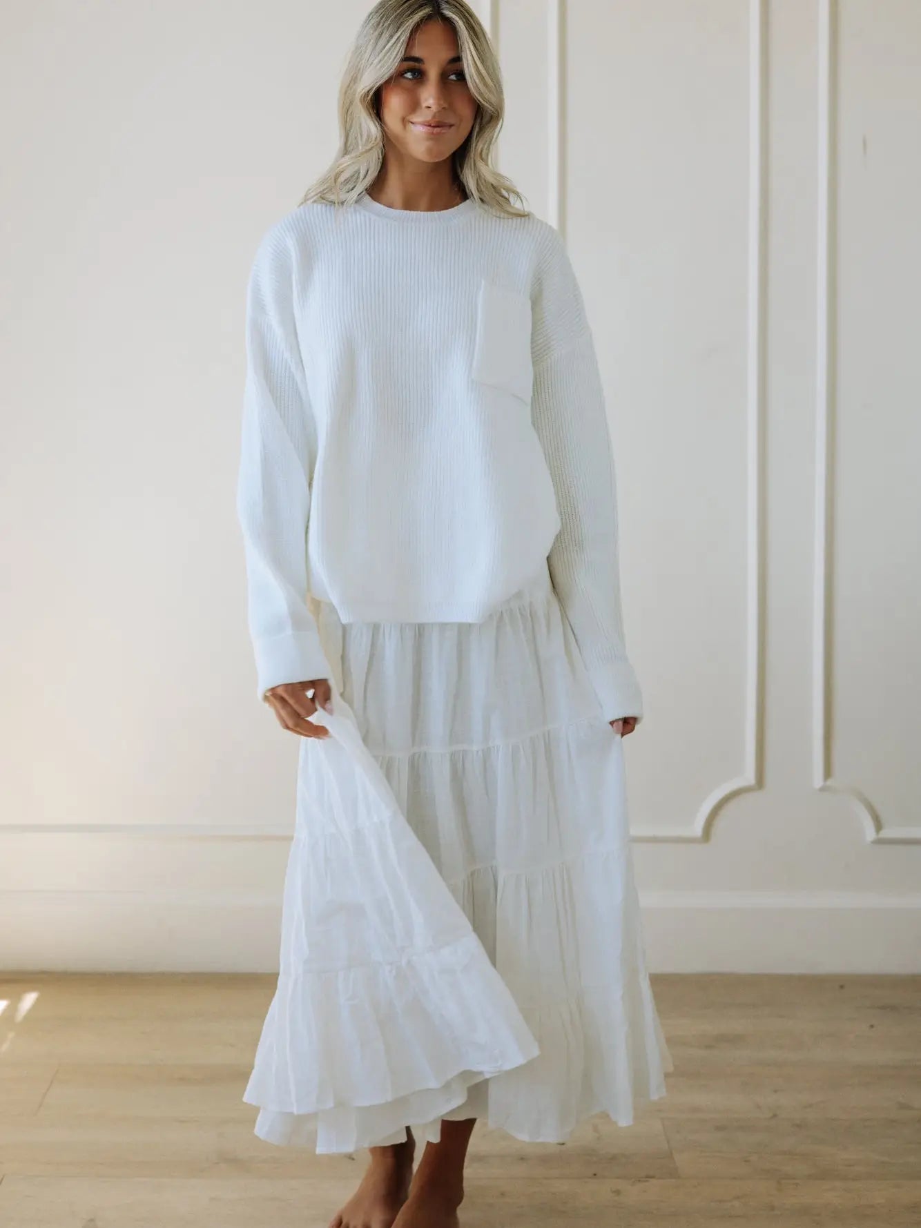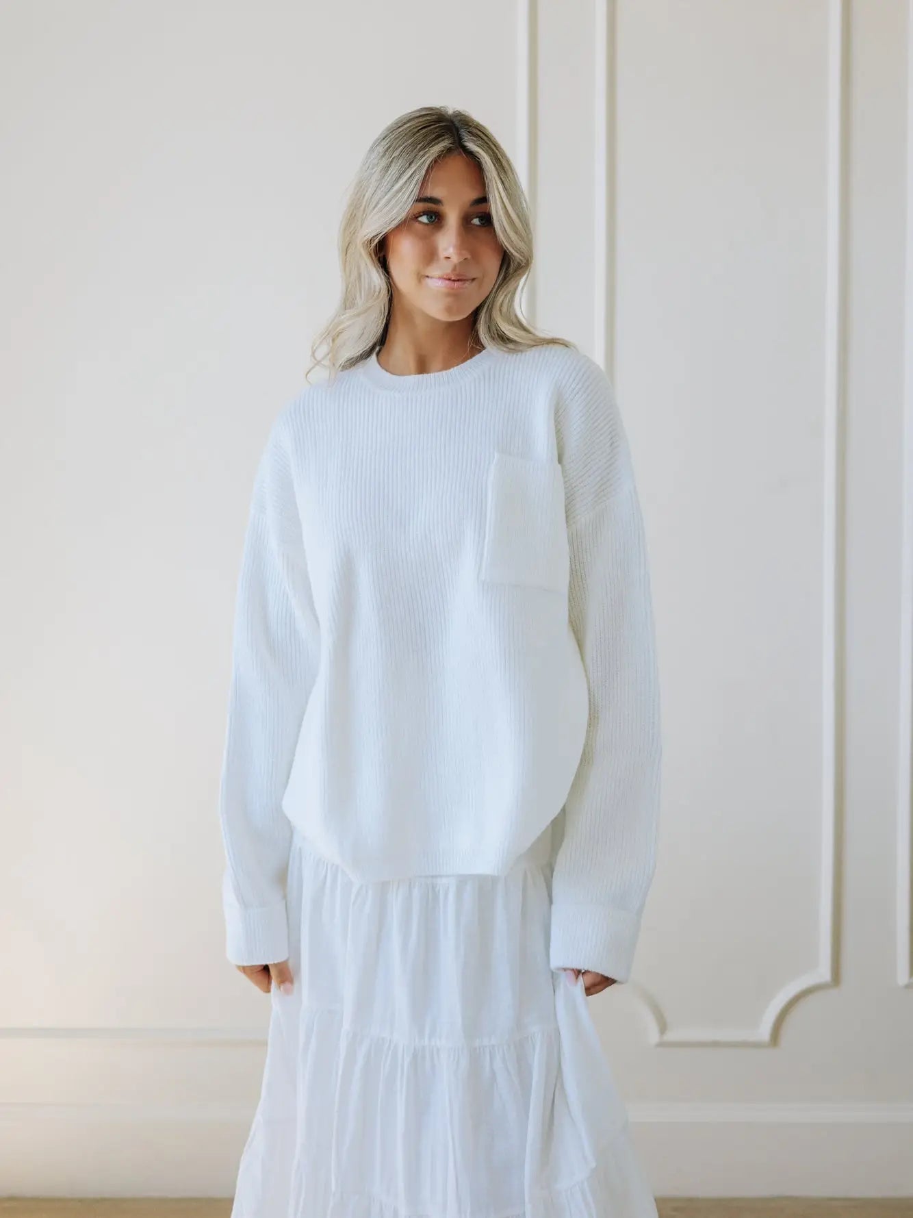 Introducing the Claire pullover sweater, designed for stylish comfort. Crafted in a chic ivory hue, this LDS temple sweater features a convenient pocket for added functionality. Elevate your wardrobe with this exclusive piece.