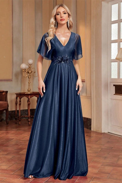 Picture yourself in this stunning blue evening gown that's basically a work of art! The flutter sleeves add a touch of whimsy, while delicate floral embroidery dances across the fabric with just enough sparkle to catch the light. It's the kind of dress that makes you feel like the main character at prom—elegant, enchanting, and absolutely unforgettable.