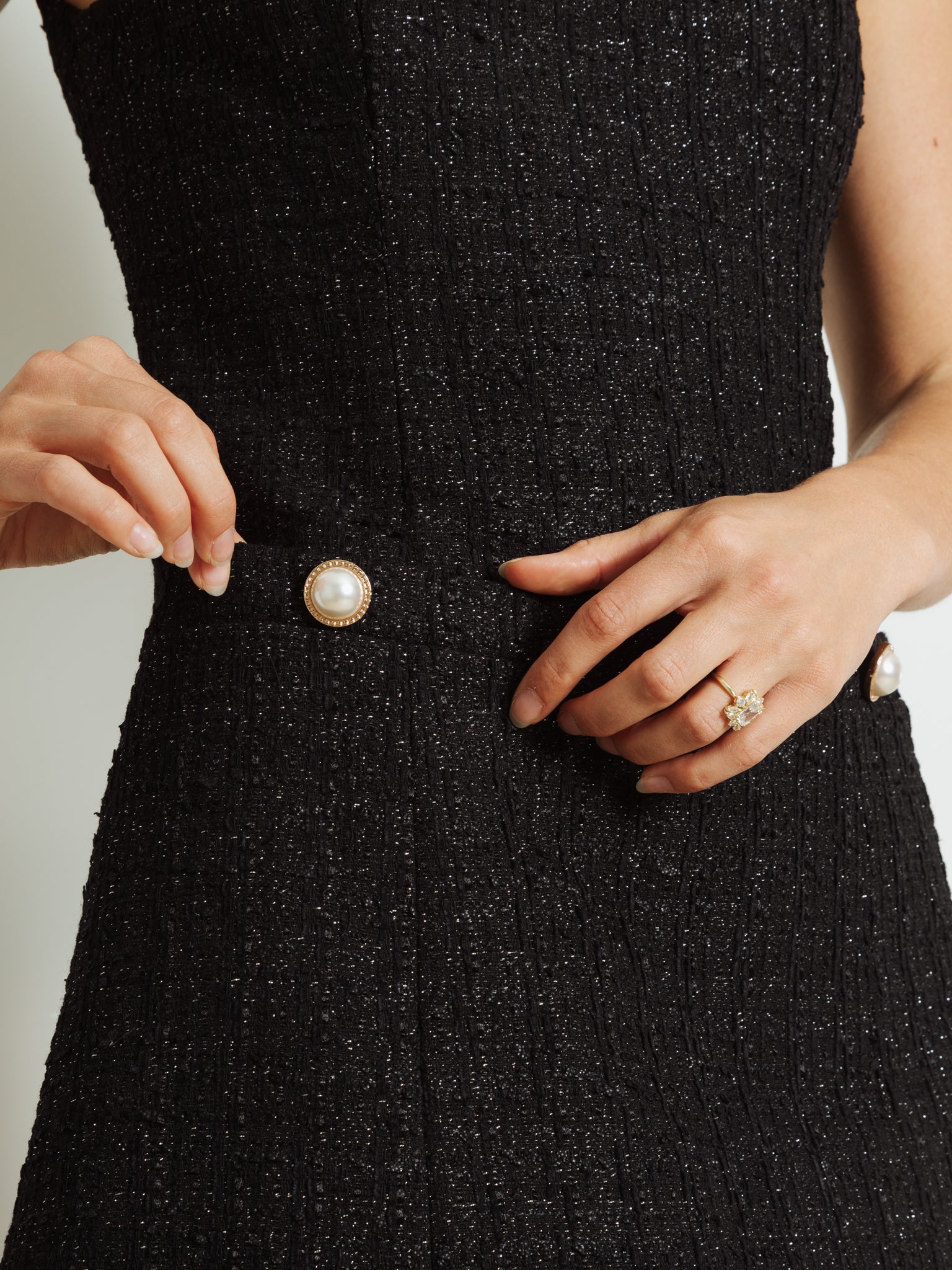 The Classic is a tweed dress with the out shell consisting of 70% polyester, 20% cotton, and 10% acrylic. This dress's underskirt is made of 100% polyester. Lastly the built in shorts are 88% polyester and 12% elastane. Due to the fine material, these dresses are Dry Clean only or hand wash, line dry.