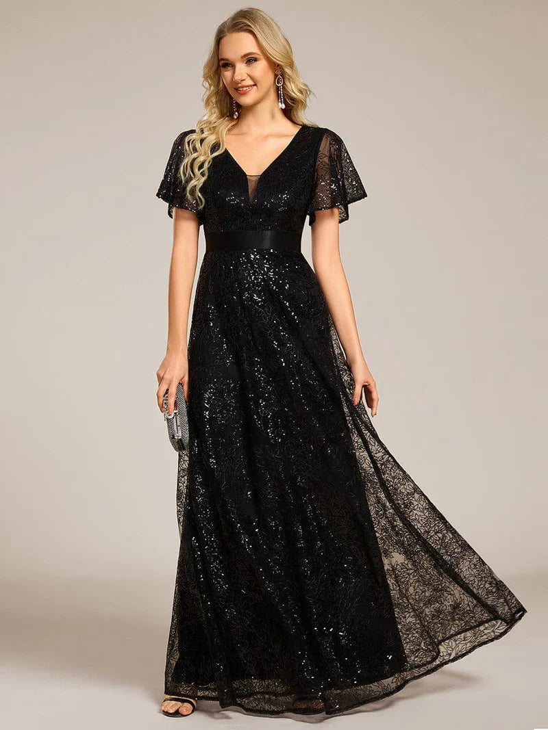 Make a dazzling entrance in this illusion V-neck sequin formal gown. This maxi dress features short sleeves and intricate sequin detailing that exudes glamour. Designed to elongate your silhouette, its flowing skirt pairs perfectly with the sparkling bodice. Whether for a gala, formal event, or black-tie wedding, this dress guarantees unforgettable moments.