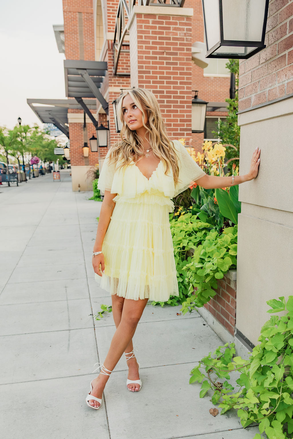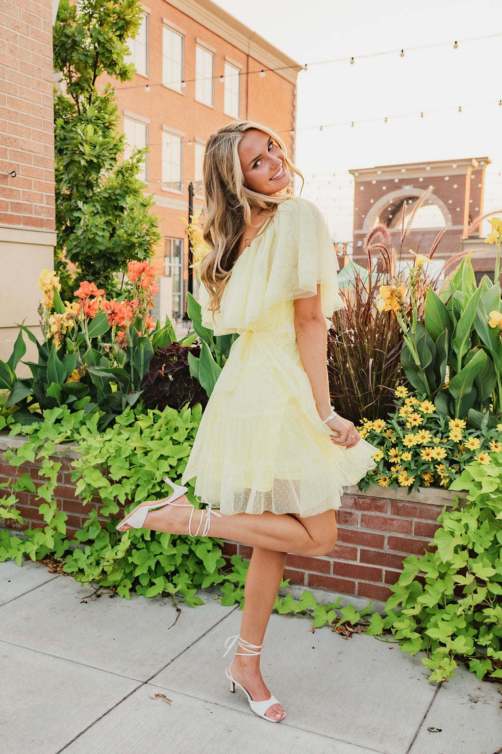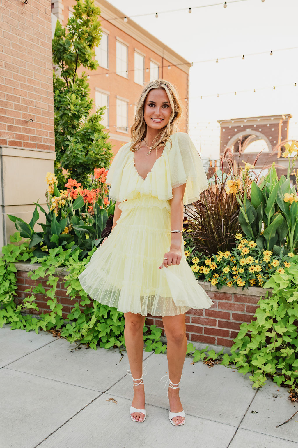 Short Butter yellow polka dotted tiered tulle dress. V-neck with mirrored back and loose fitting sleeves, a cute tie bow does it up in the back.
