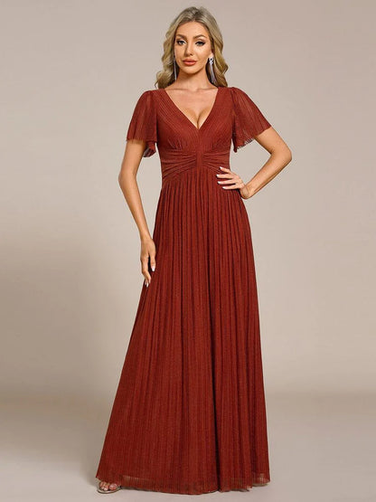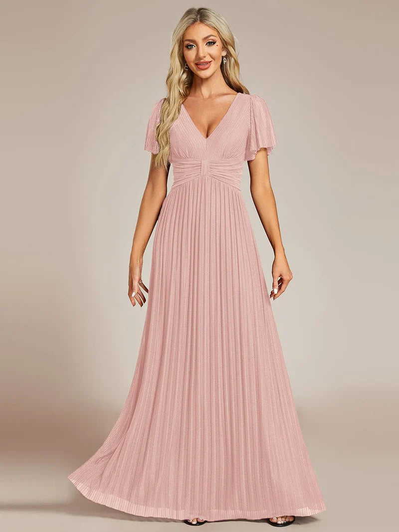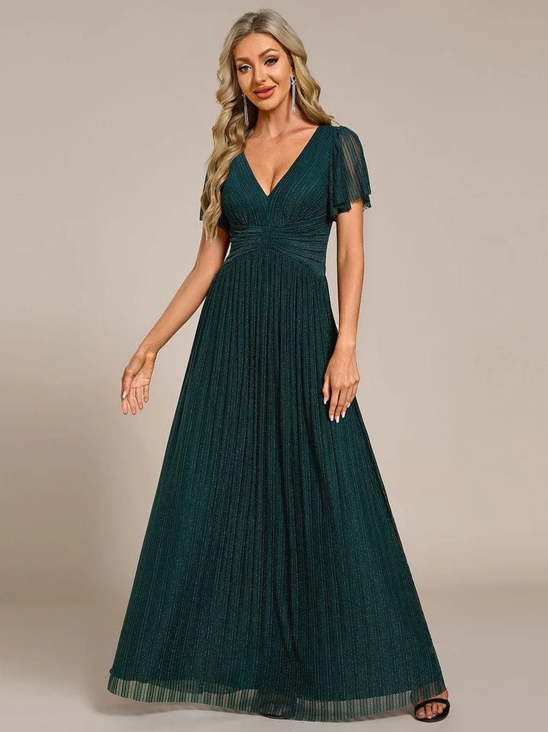 This evening dress is made of fashionable silver mesh fabric and has a unique V-neck design, showing a charming neck line, while the pleat decoration on the waist adds a fashionable look to the overall look.