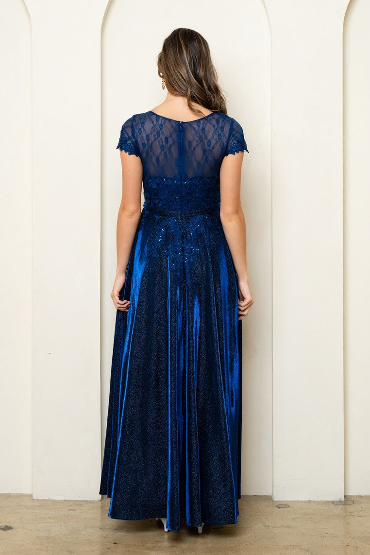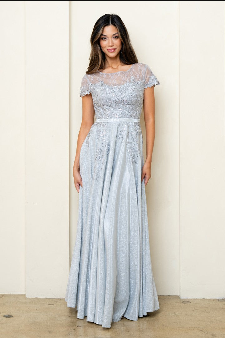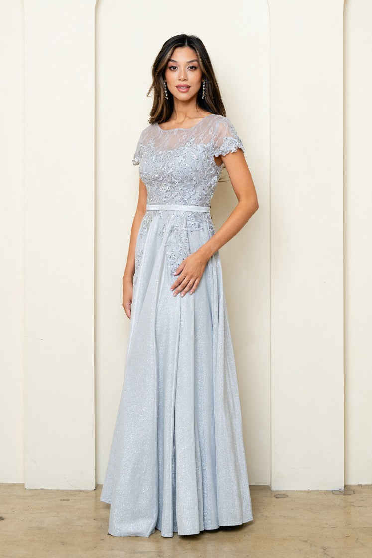 This playful modest dress features a metallic cap sleeve design with a lace-embroidered bodice adorned with sparkling stones. The glittery fabric flows into a full skirt, while the fully lined interior includes built-in bra cups for comfort. A back zipper makes slipping into this stunning gown a breeze.