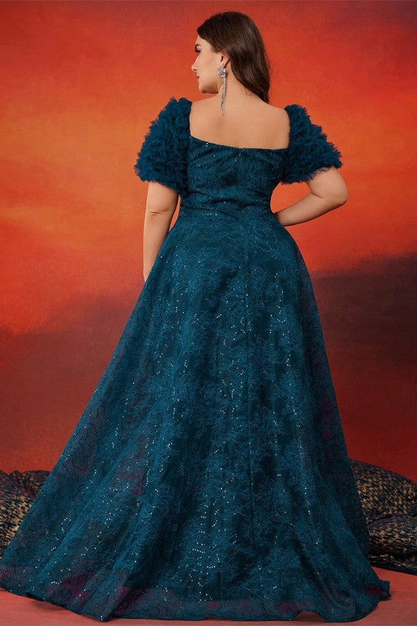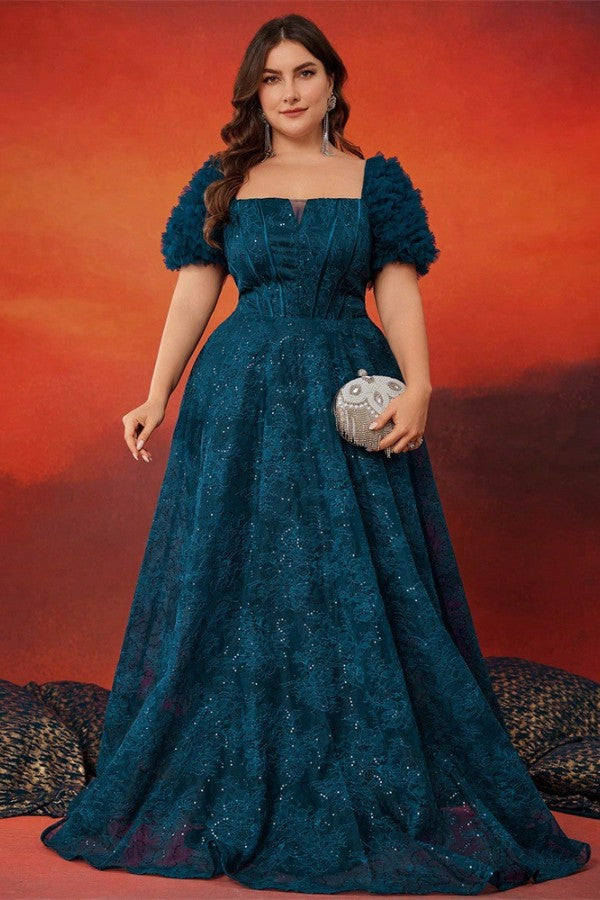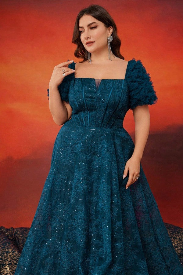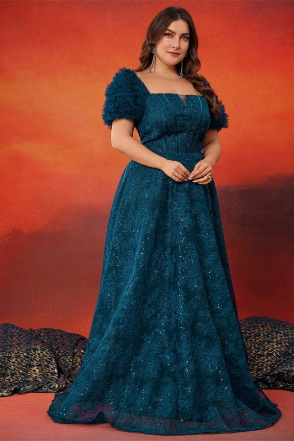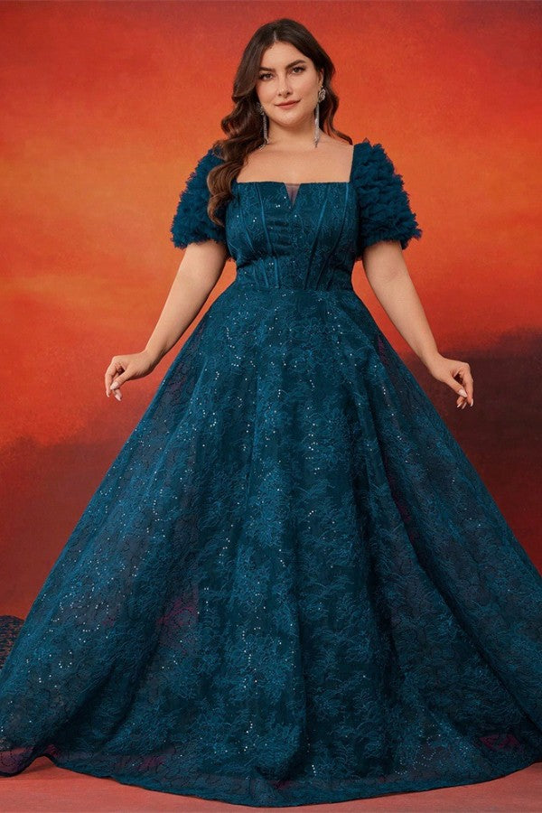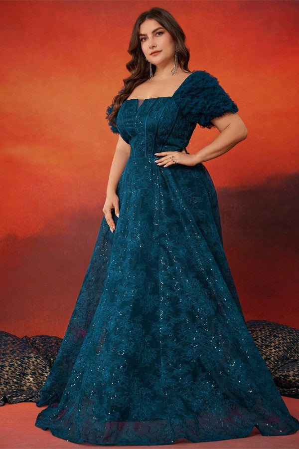 Slip into elegance with this charming plus-size evening gown that knows how to make an entrance. The structured A-line silhouette flatters every curve, while the square neckline and short sleeves strike that perfect balance between sophisticated and playful. A boned waist cinches you in all the right places, creating a polished look that's ready for any celebration. Whether it's prom, a formal party, or a night out that calls for something special, this gown delivers confidence and style in one stunning package.