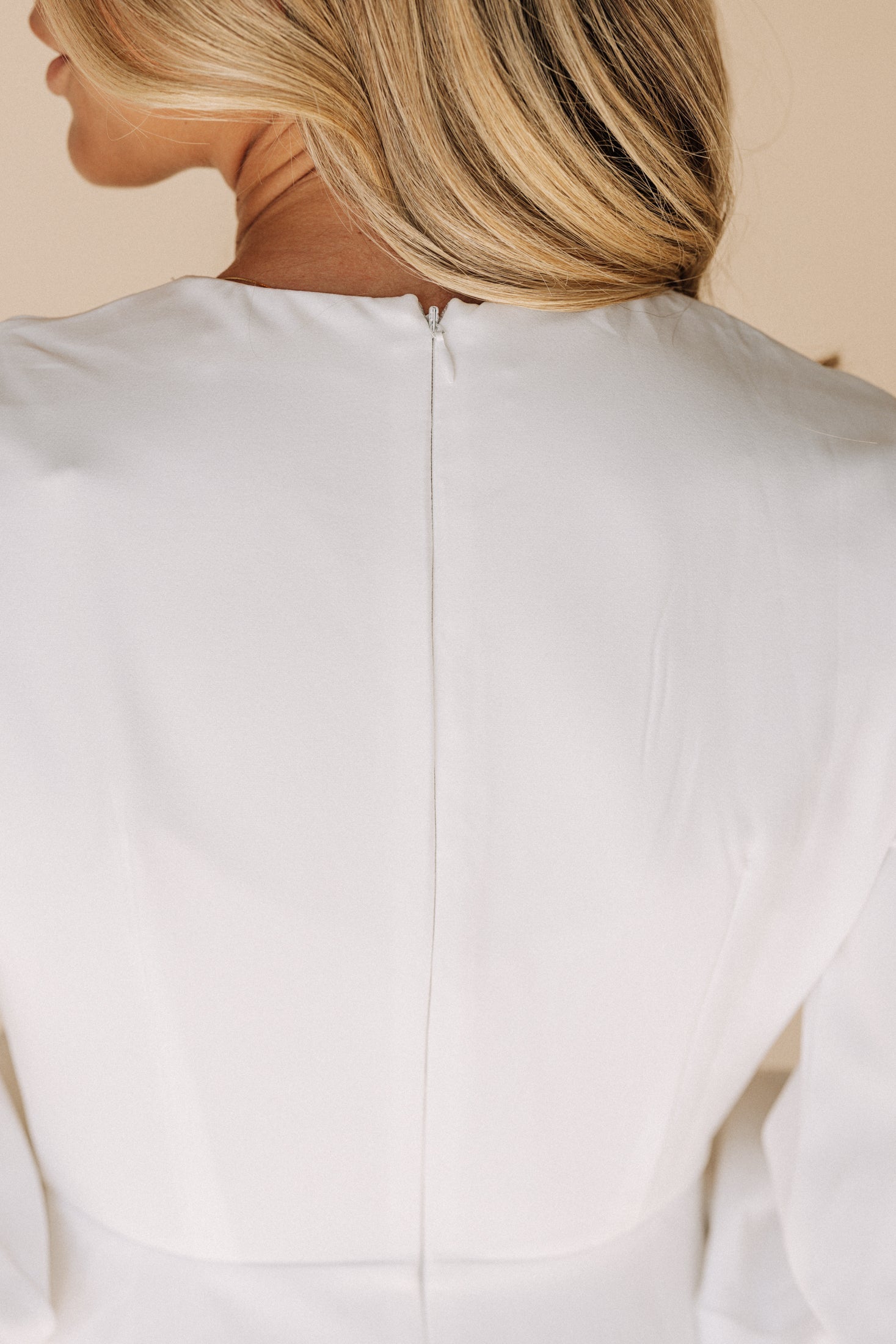 Indulge in the elegant simplicity of the Haven LDS Temple Gown. The empire waist and pleated bodice detail create a flattering silhouette, while the round neck and back zipper provide effortless comfort. Perfect for your special temple occasions.