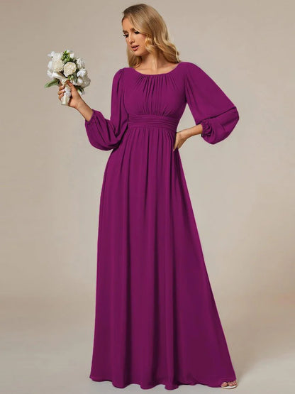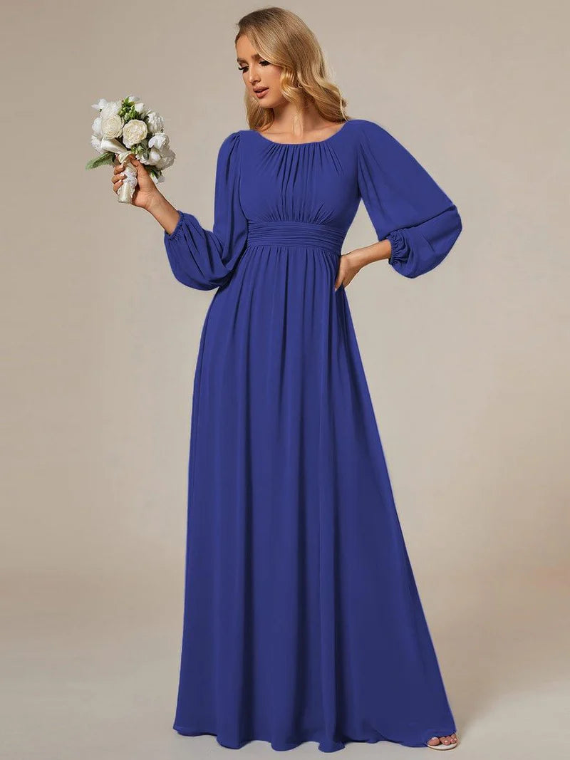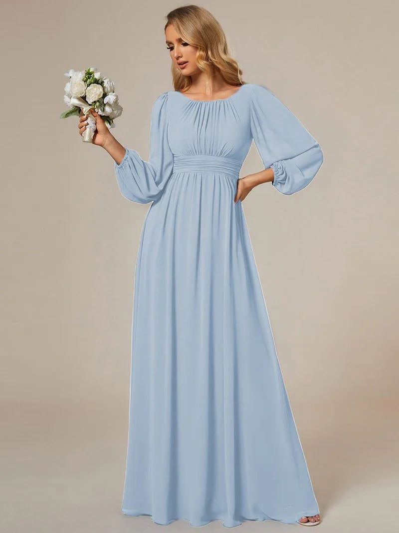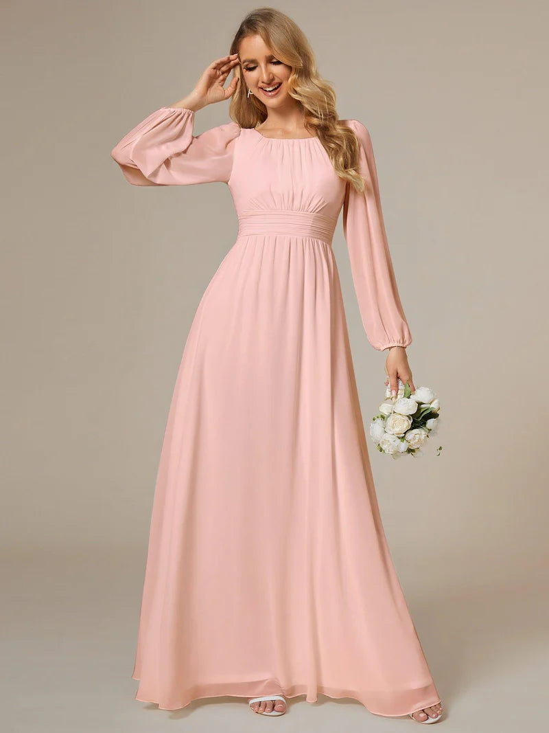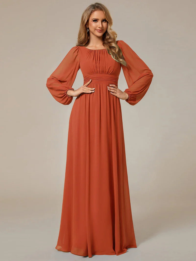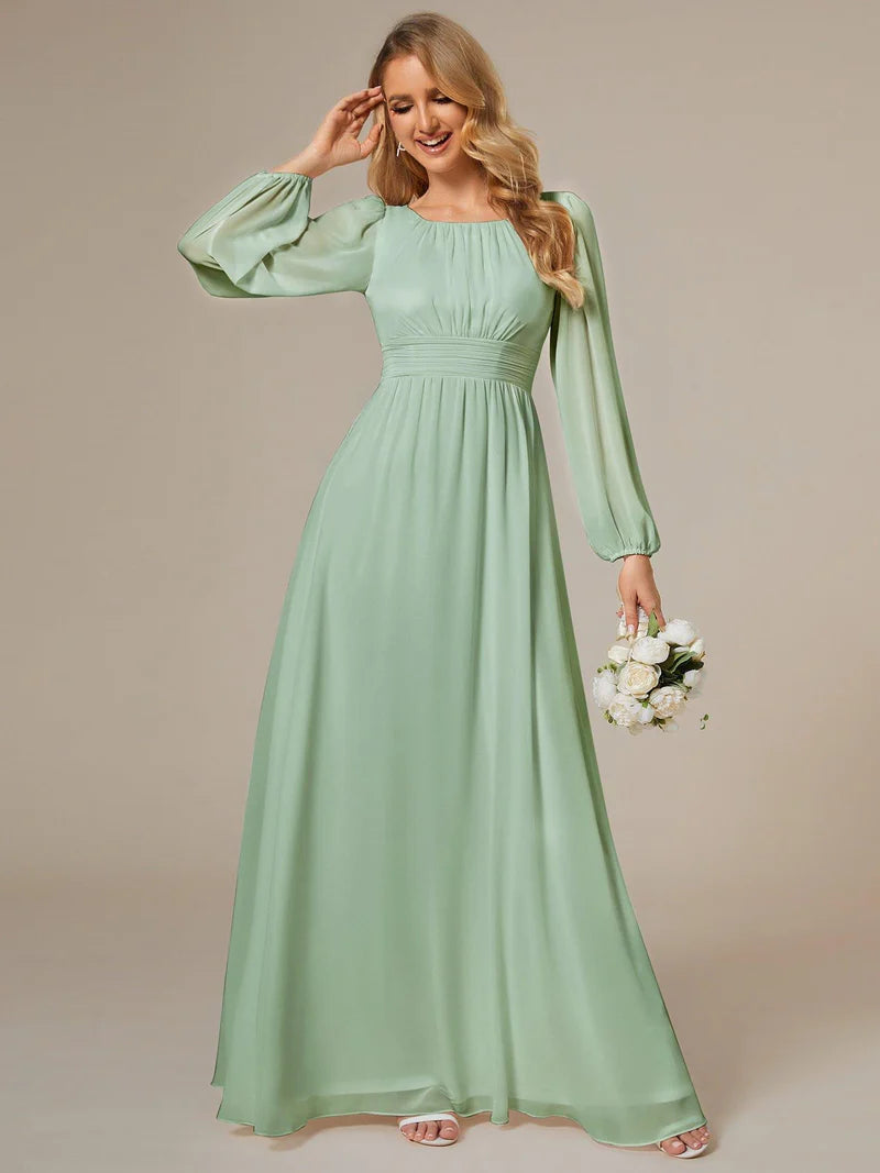 This romantic chiffon lantern sleeve Empire Waist Ruched bridesmaid dress leaves a lingering impression of elegance. Featuring sheer puffed long sleeves, a cinched empire waist, and flattering ruching, making it perfect for an outdoor wedding. The A-line floor-length silhouette can be paired with metallic, black, white, and nude heels.