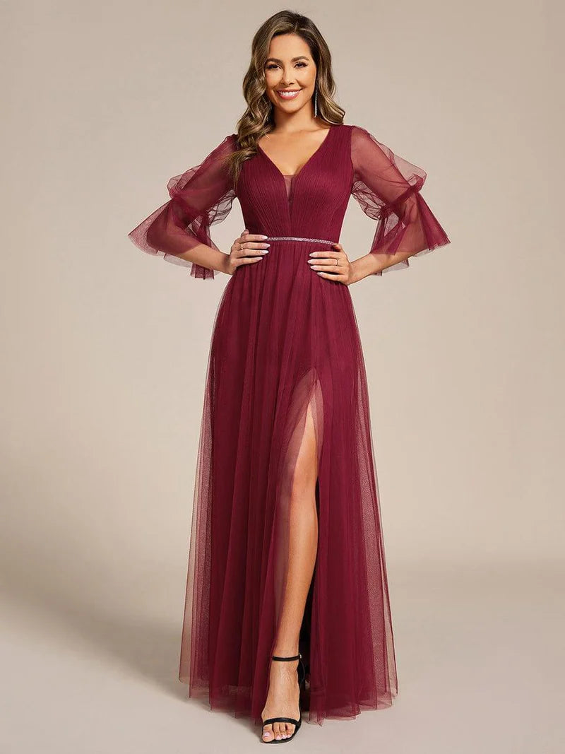 Featuring dramatic lantern sleeves and a subtle side split, this maxi bridesmaid dress combines elegance and modernity. Ideal for winter weddings, evening receptions, or formal gatherings.