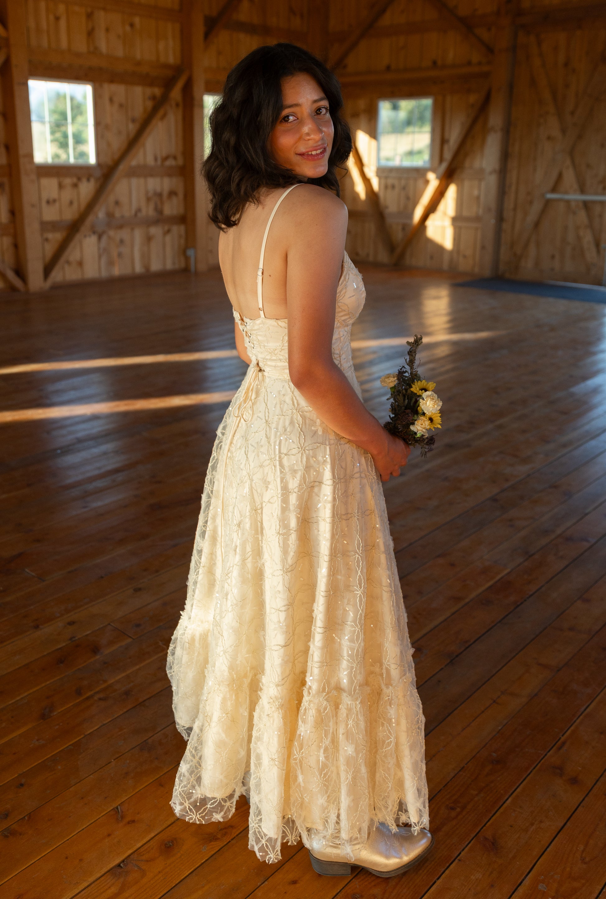 Sparkly cream tulle midi dress. Enhanced sweetheart neckline with lace up corset back and structured bodice.