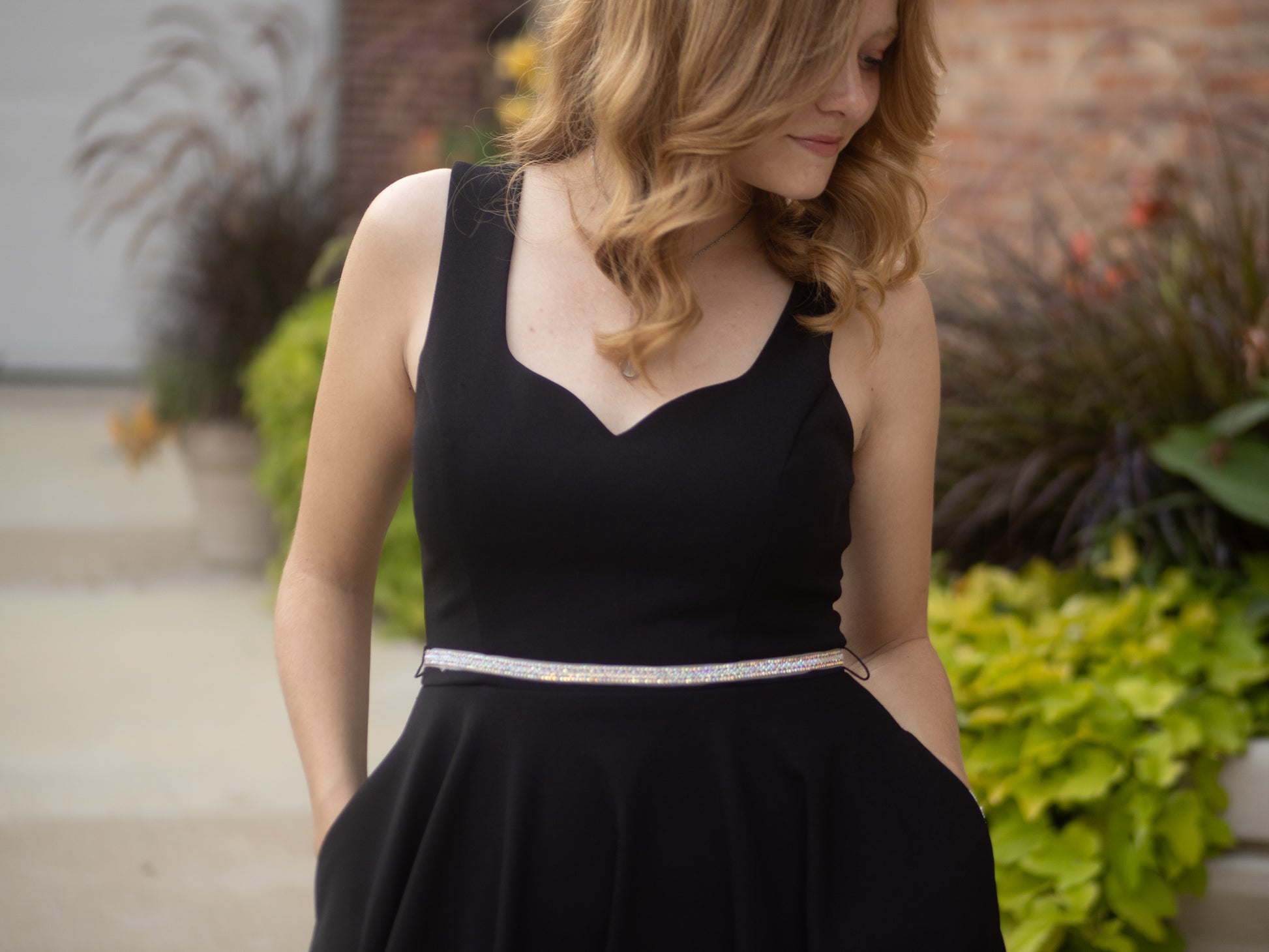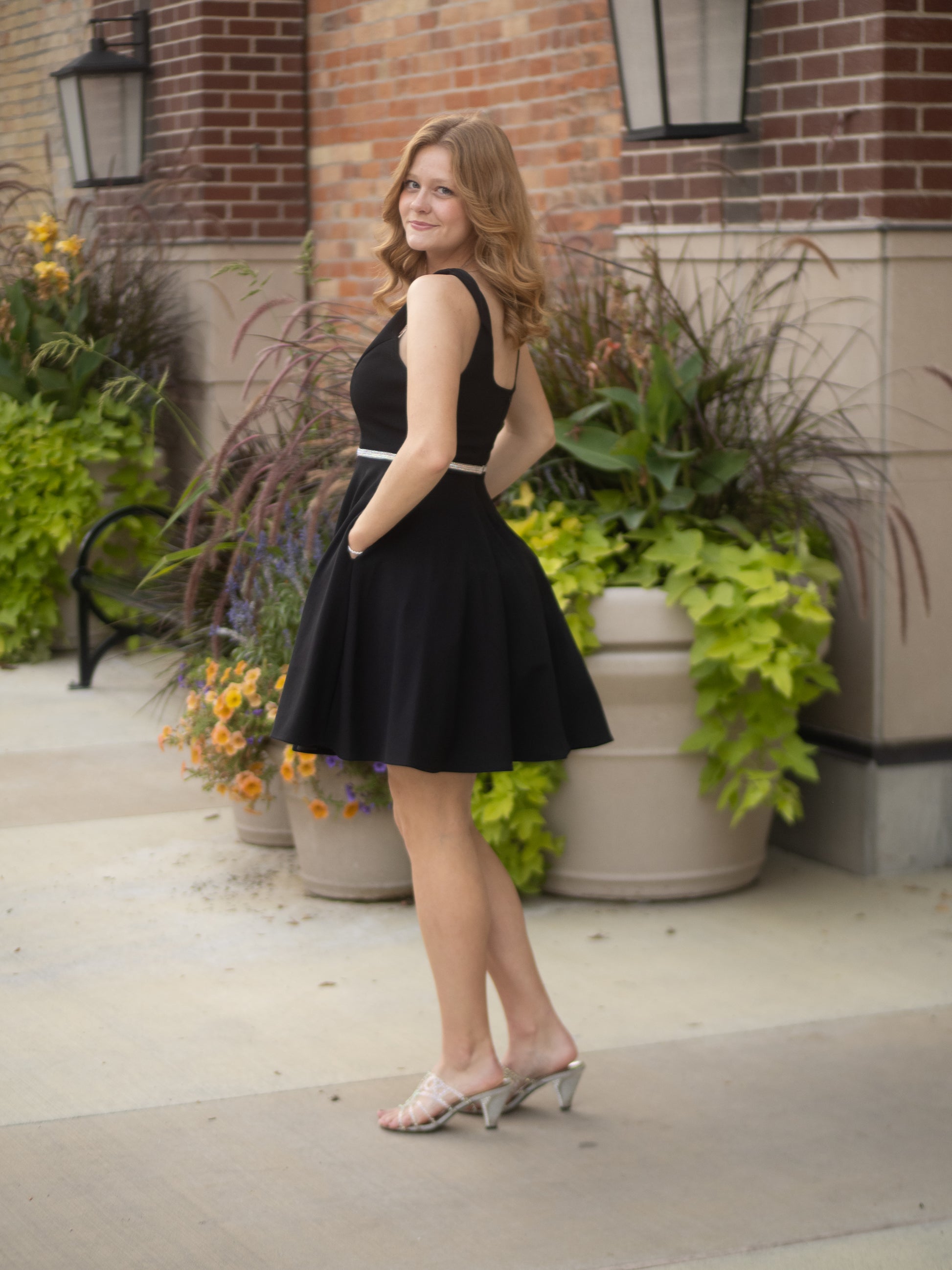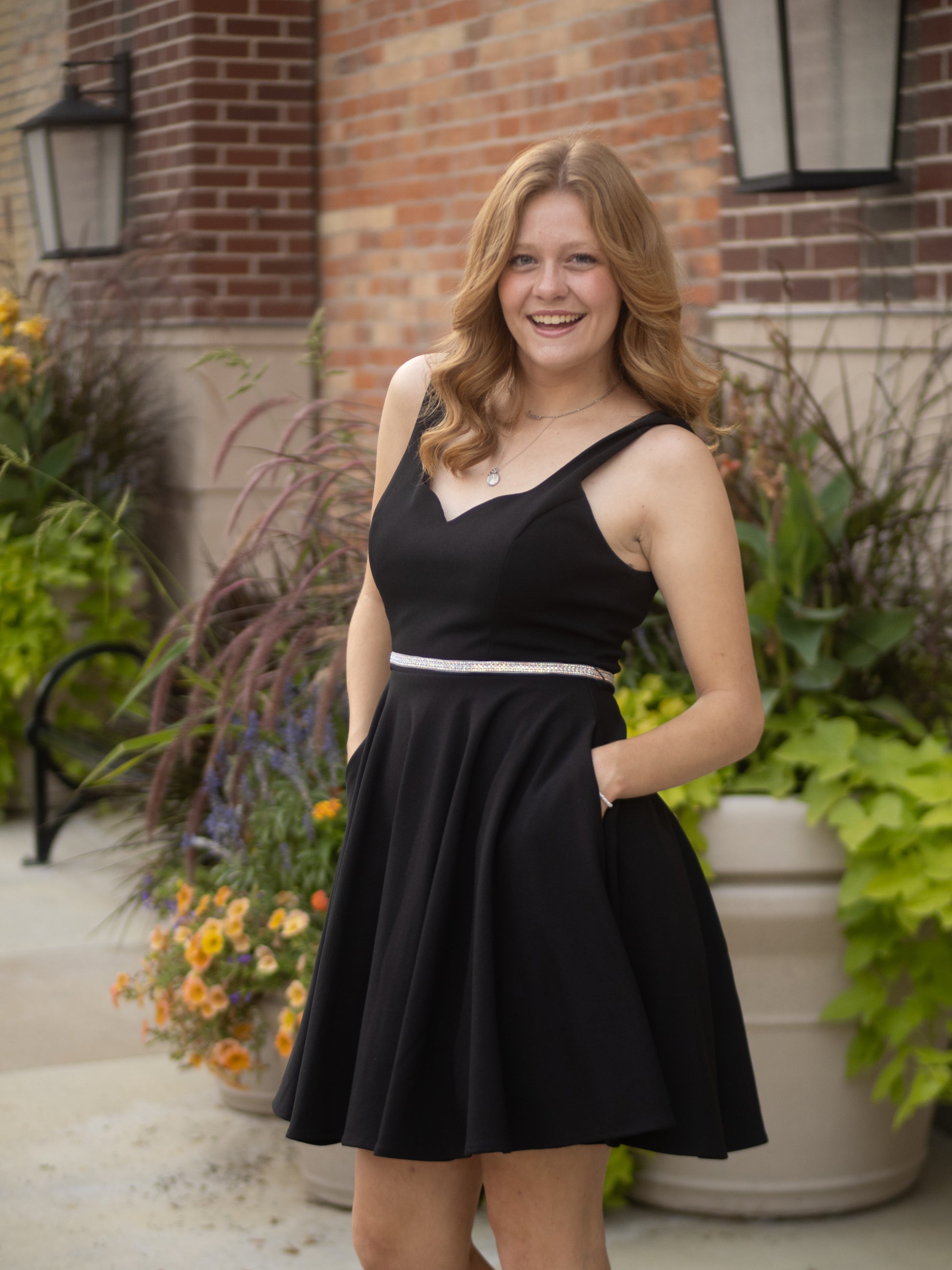 This playful short dress features a sweetheart neckline and a scoop back, crafted from stretchy polyester techno crepe. Its A-line silhouette is complemented by a sparkling embellished belt with a hook and eye closure. Designed with layered lining, a hidden back zipper, and built-in bra cups, this charming dress is proudly made in the USA.