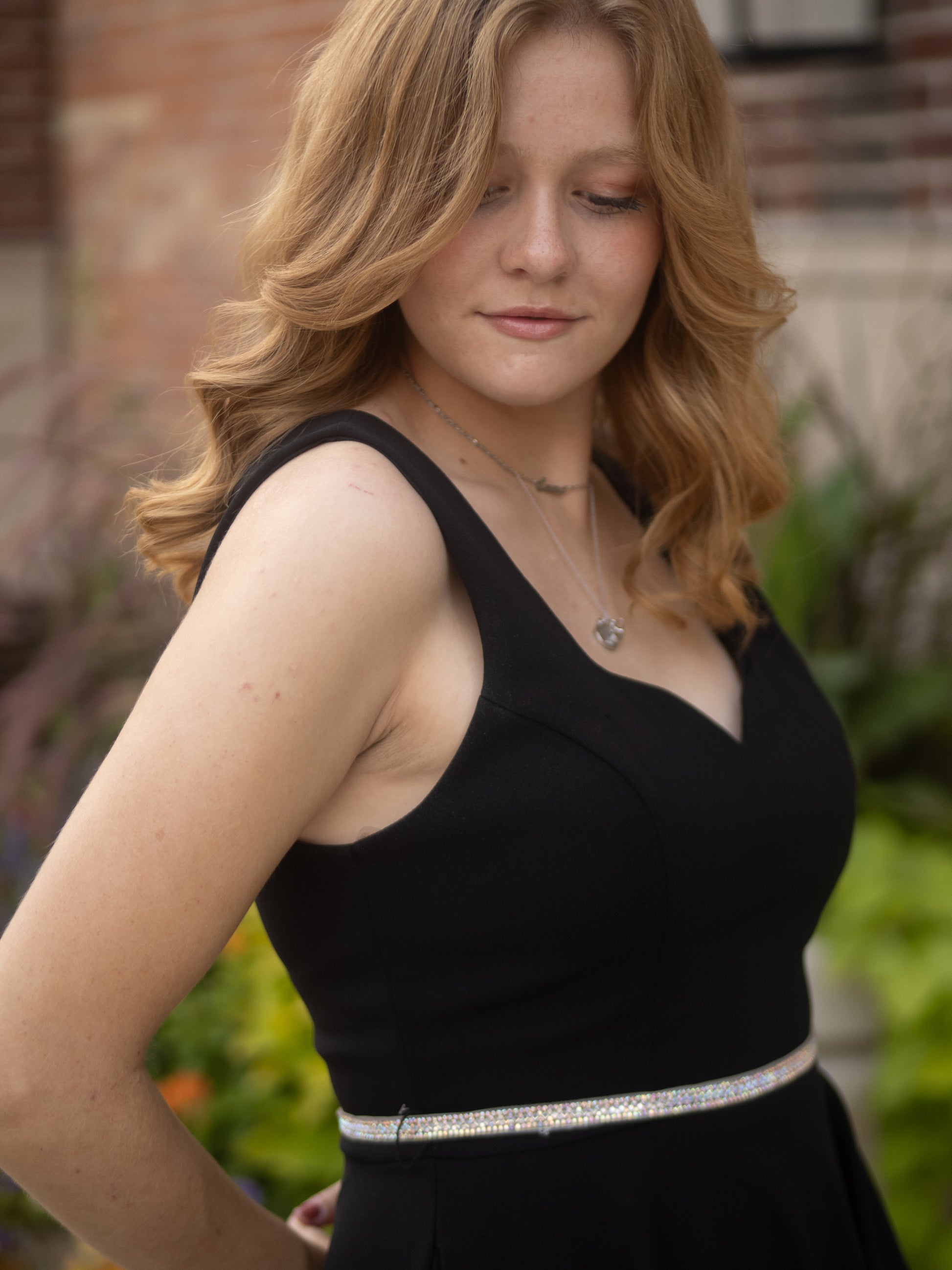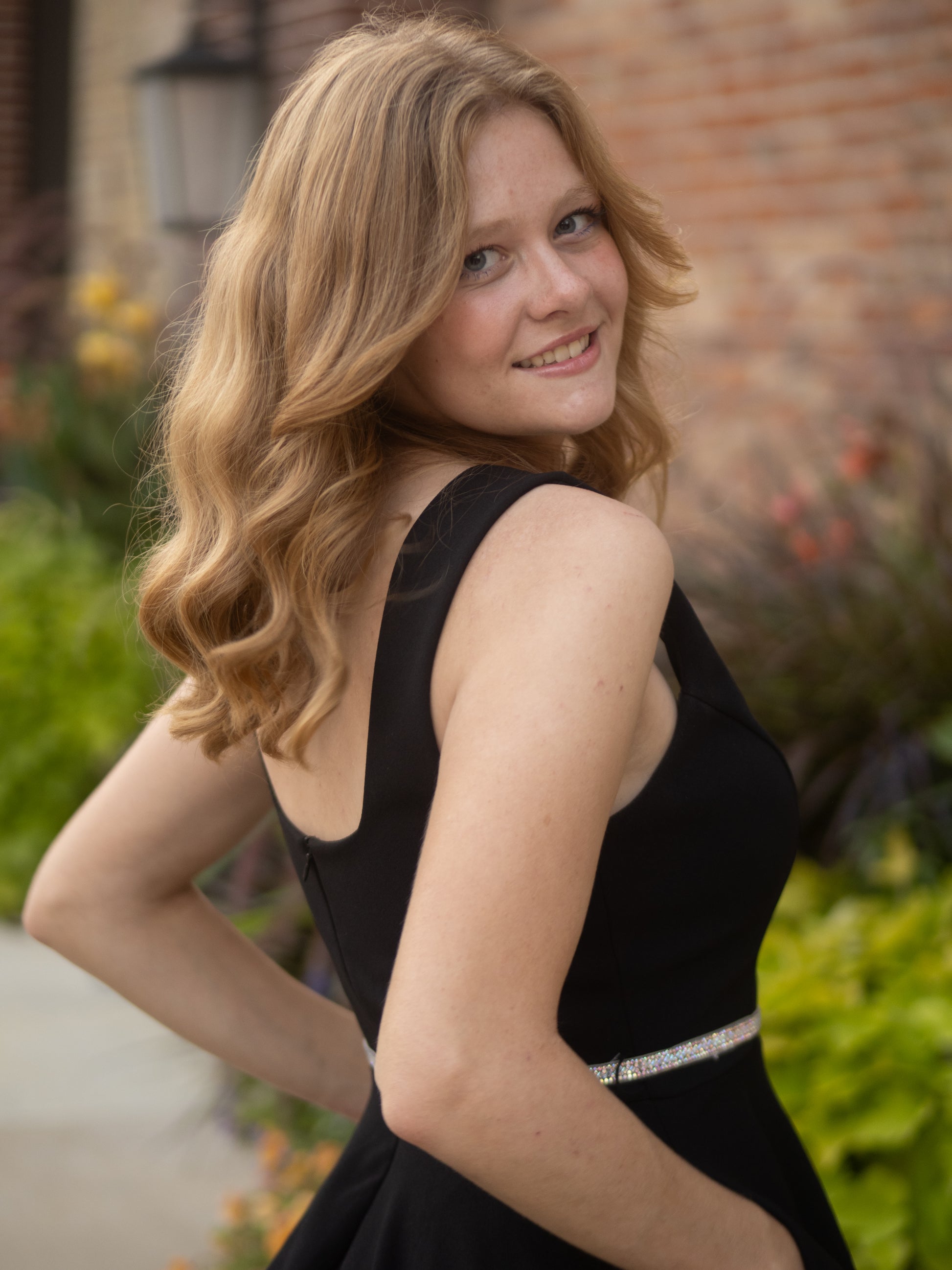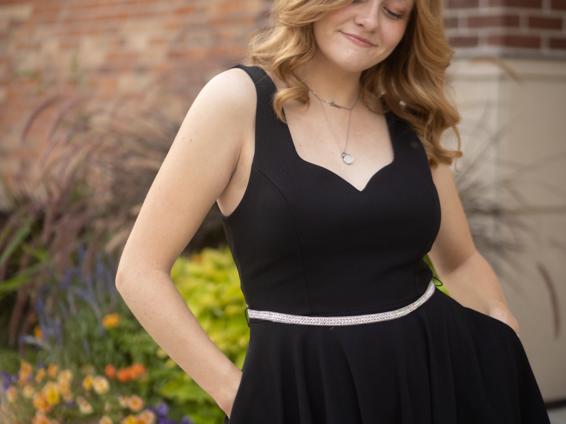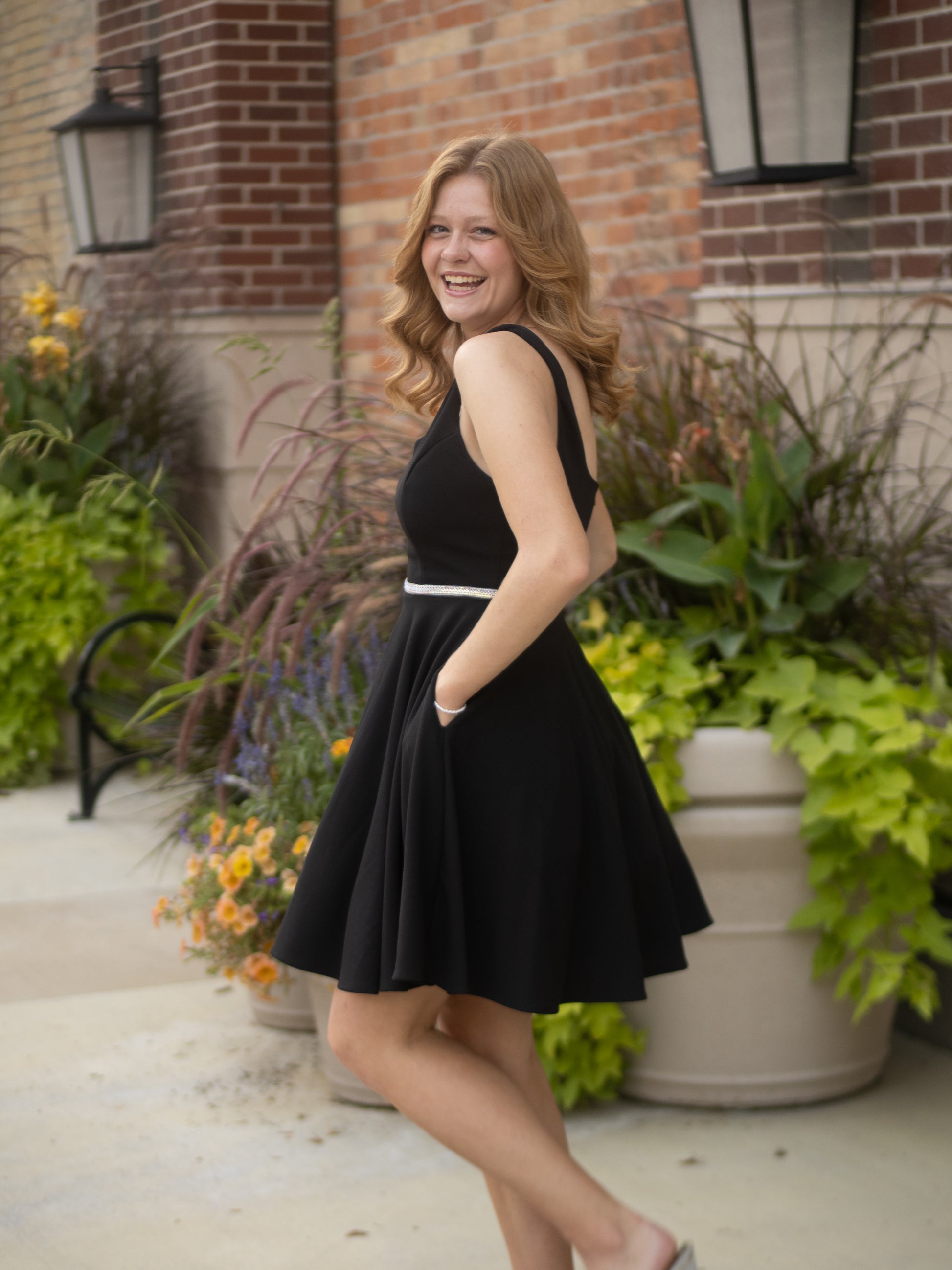 This playful short dress features a sweetheart neckline and a scoop back, crafted from stretchy polyester techno crepe. Its A-line silhouette is complemented by a sparkling embellished belt with a hook and eye closure. Designed with layered lining, a hidden back zipper, and built-in bra cups, this charming dress is proudly made in the USA.