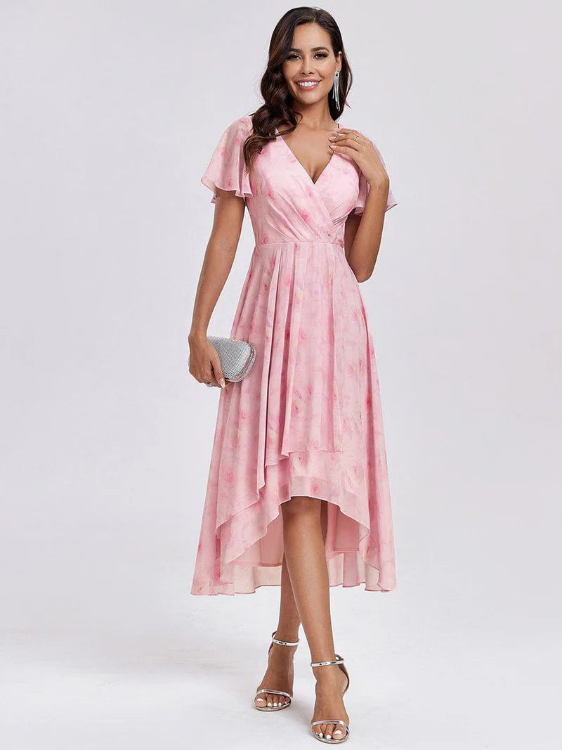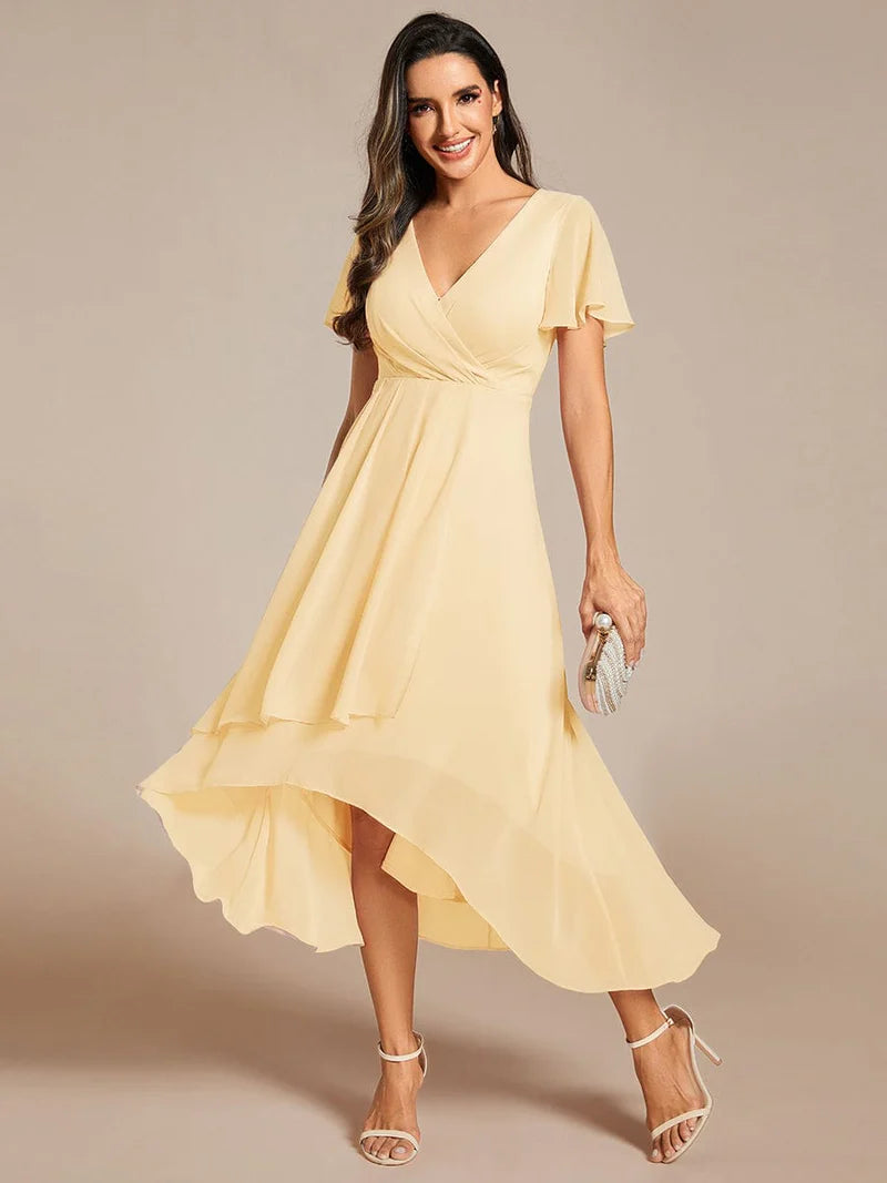 Elevate your style with our Ruffles Sleeve Pleated V-Neck A-Line Midi Chiffon Wedding Guest Dress. The delicate ruffled sleeves and pleated detailing add a touch of romance to this enchanting midi dress. The flattering A-line silhouette and V-neck create a timeless and sophisticated look. Crafted in chiffon, this dress is perfect for wedding guests who desire both elegance and comfort.