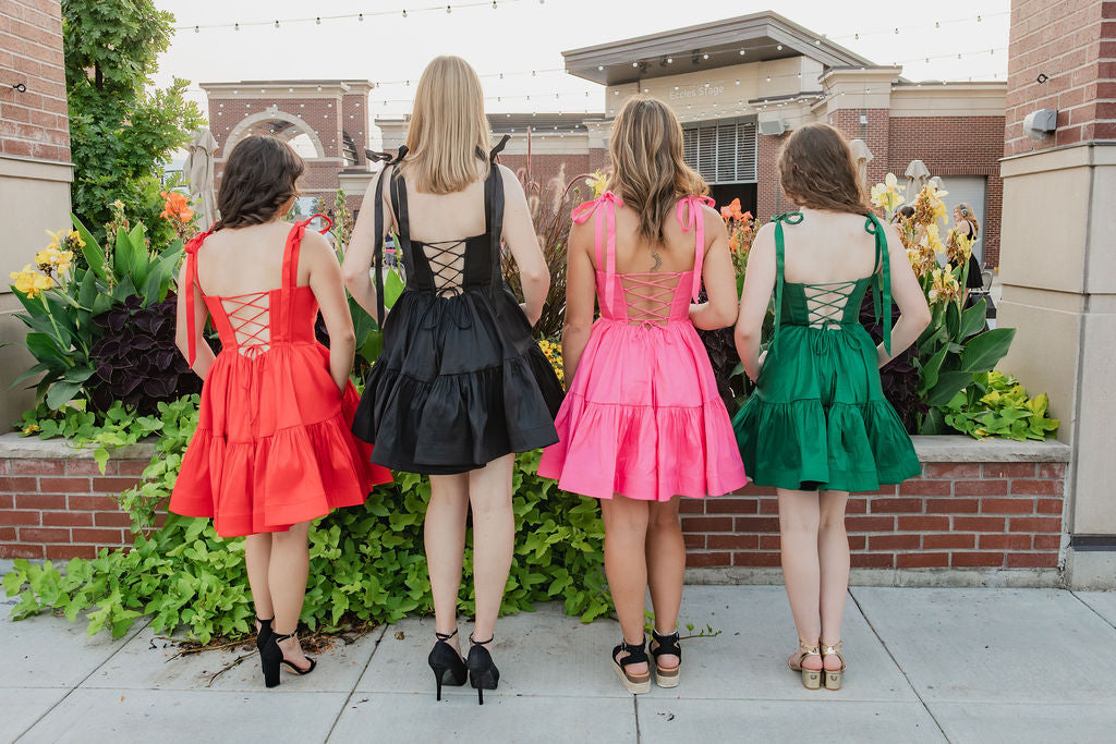 This playful tie-up sleeve dress features a charming short A-line skirt that’s perfect for twirling. The open lace-up back adds a flirty, unexpected touch, making it a standout choice for any fun occasion. Lightweight and flirty, it’s designed to keep you comfortable while turning heads. Plus POCKETS!