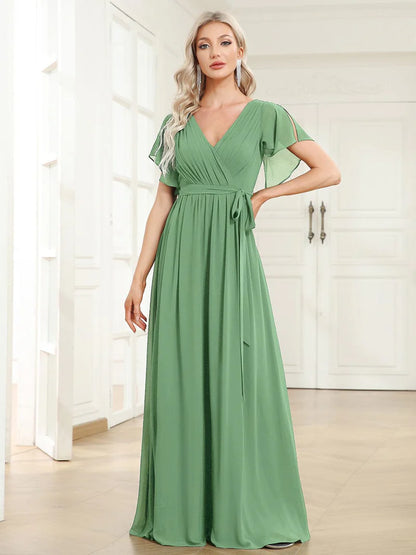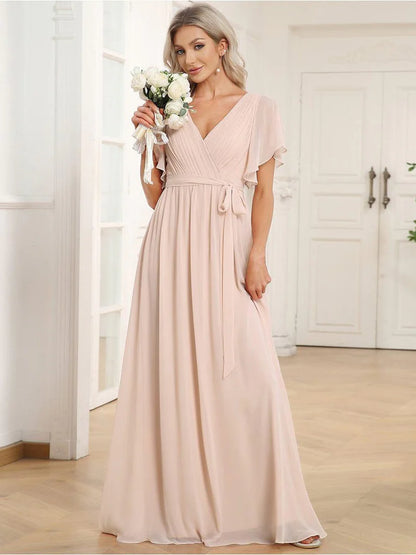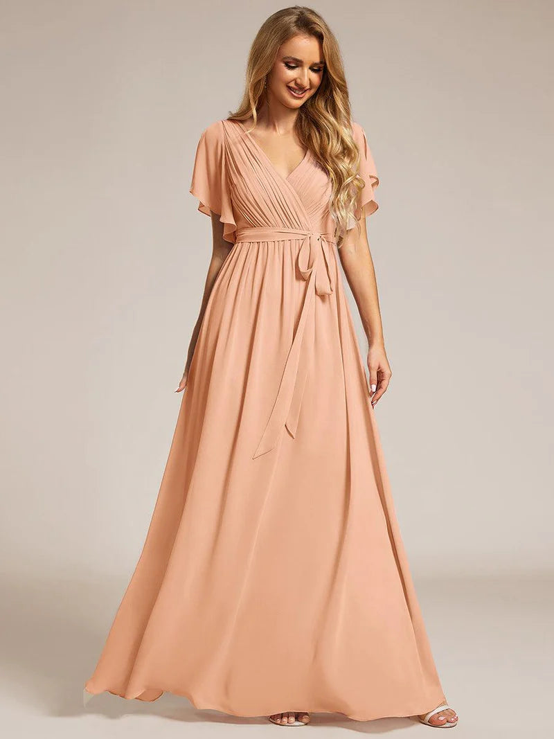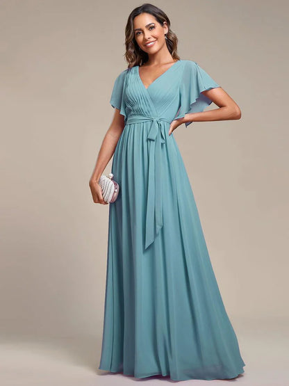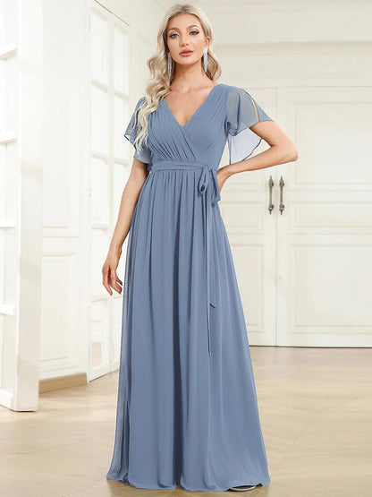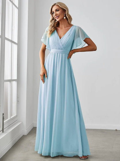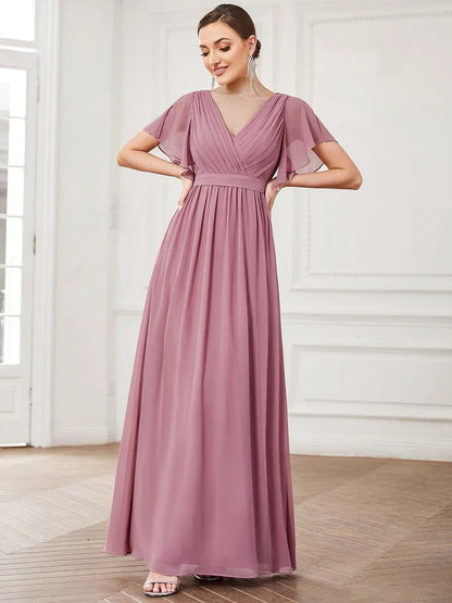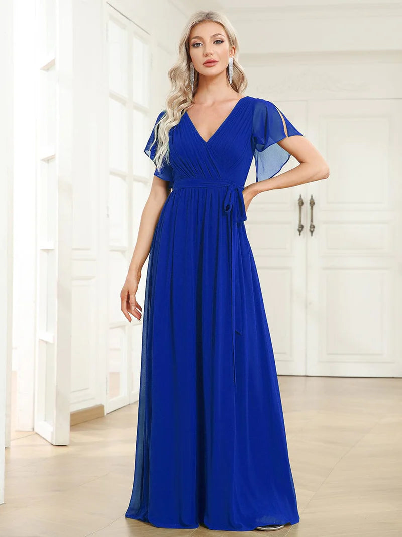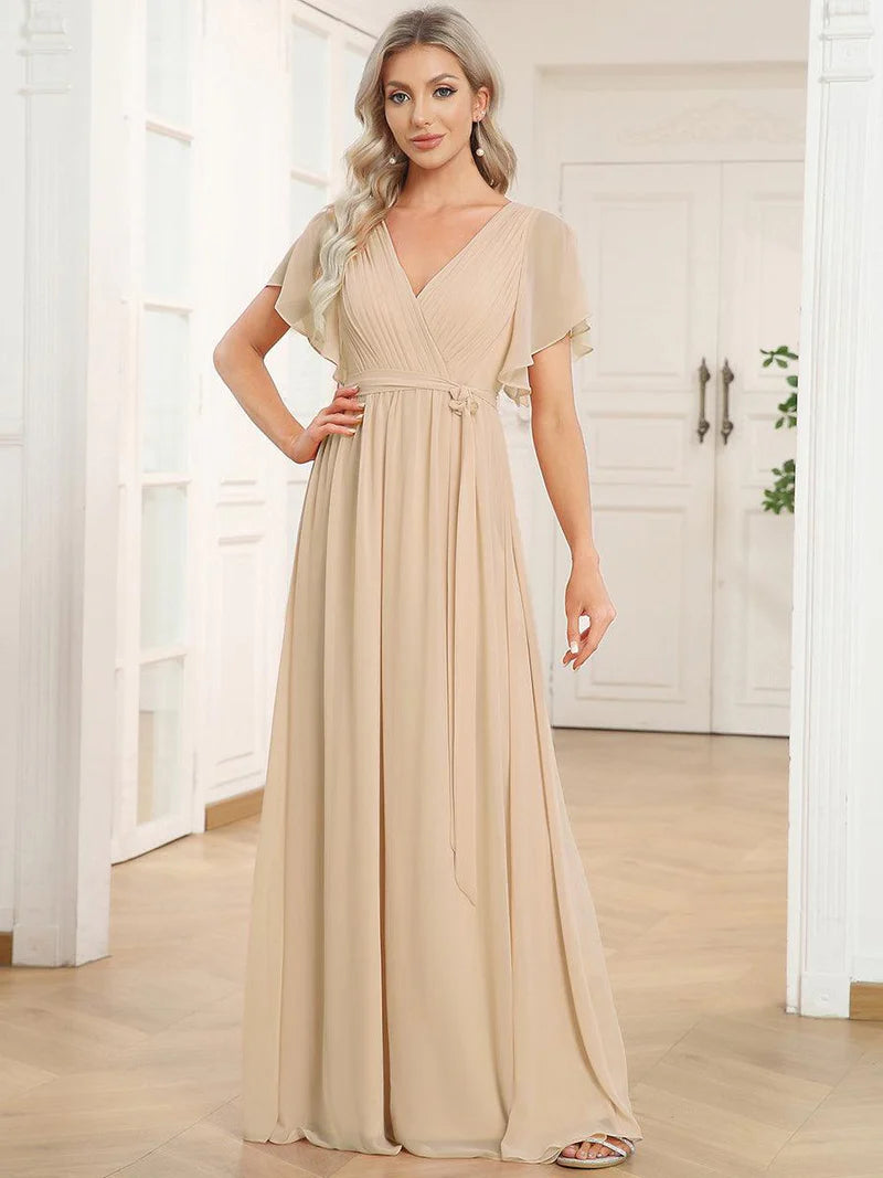 This classic A-line evening dress features pleated chiffon layers, v-neckline, light flutter sleeves, and a flowing silhouette, making it timeless and sophisticated. Pair it with black or metallic heels.