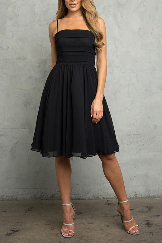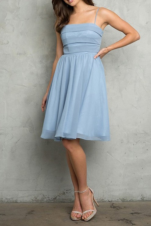 This dress is the perfect blend of sweet and sophisticated. Featuring delicate spaghetti straps and a flattering lace-up corset back, it cinches the waist for a customized fit. The skirt flows effortlessly into a knee-length A-line silhouette, crafted from lightweight chiffon that moves with grace. Romantic yet playful, this dress is ideal for weddings, parties, and any occasion where you want to feel both elegant and effortless.