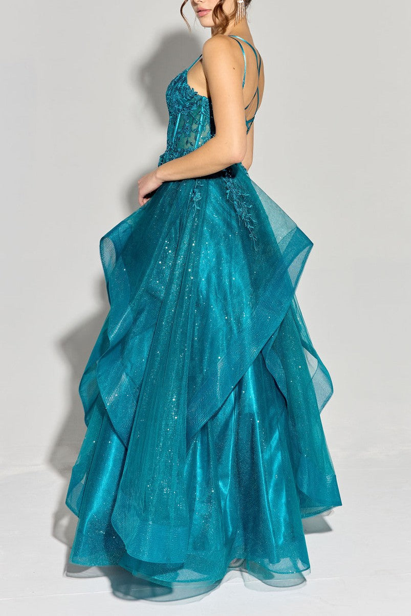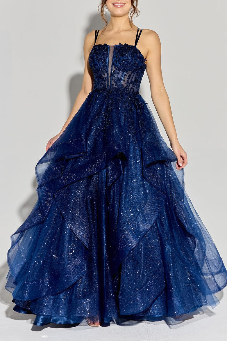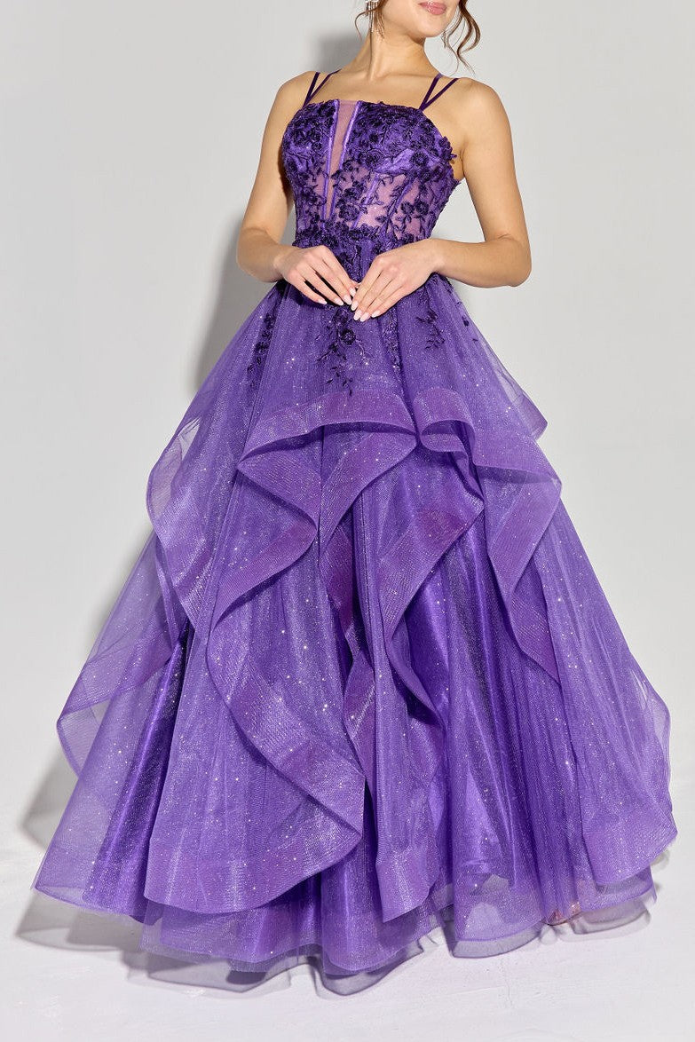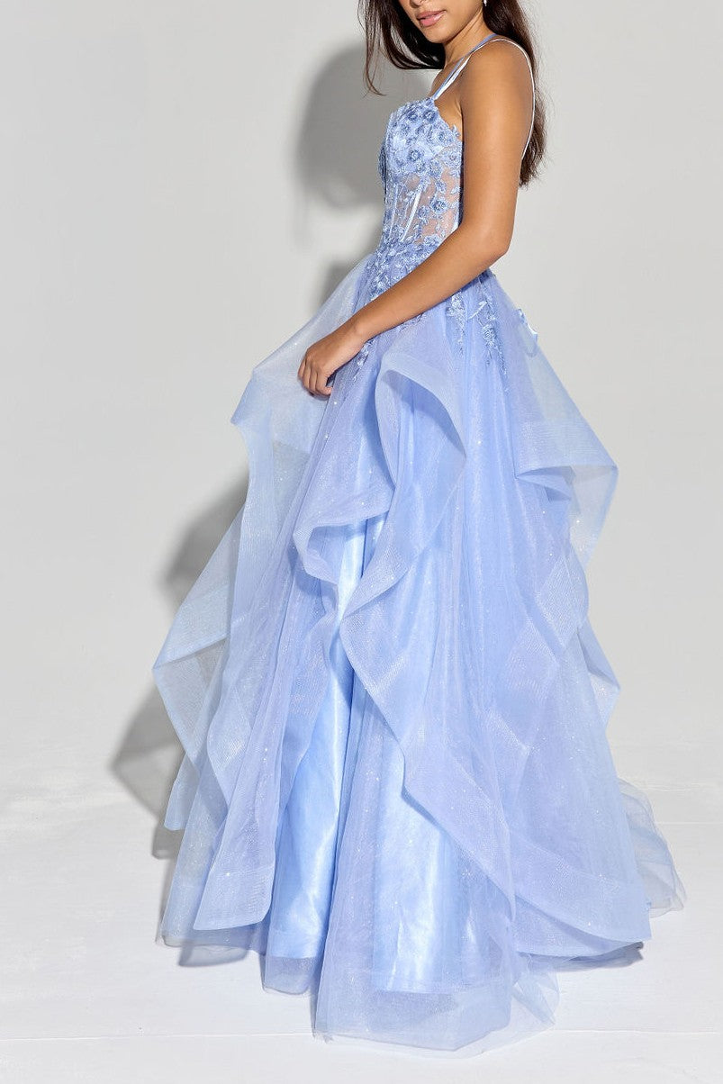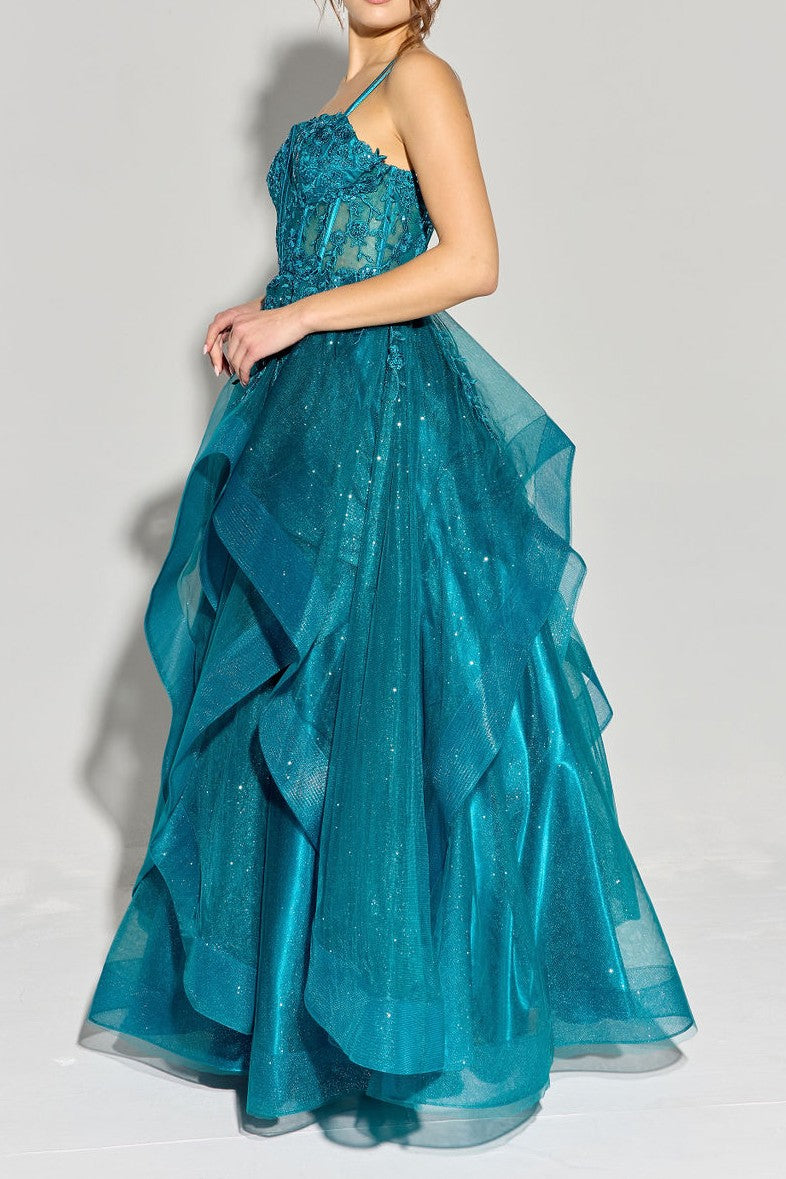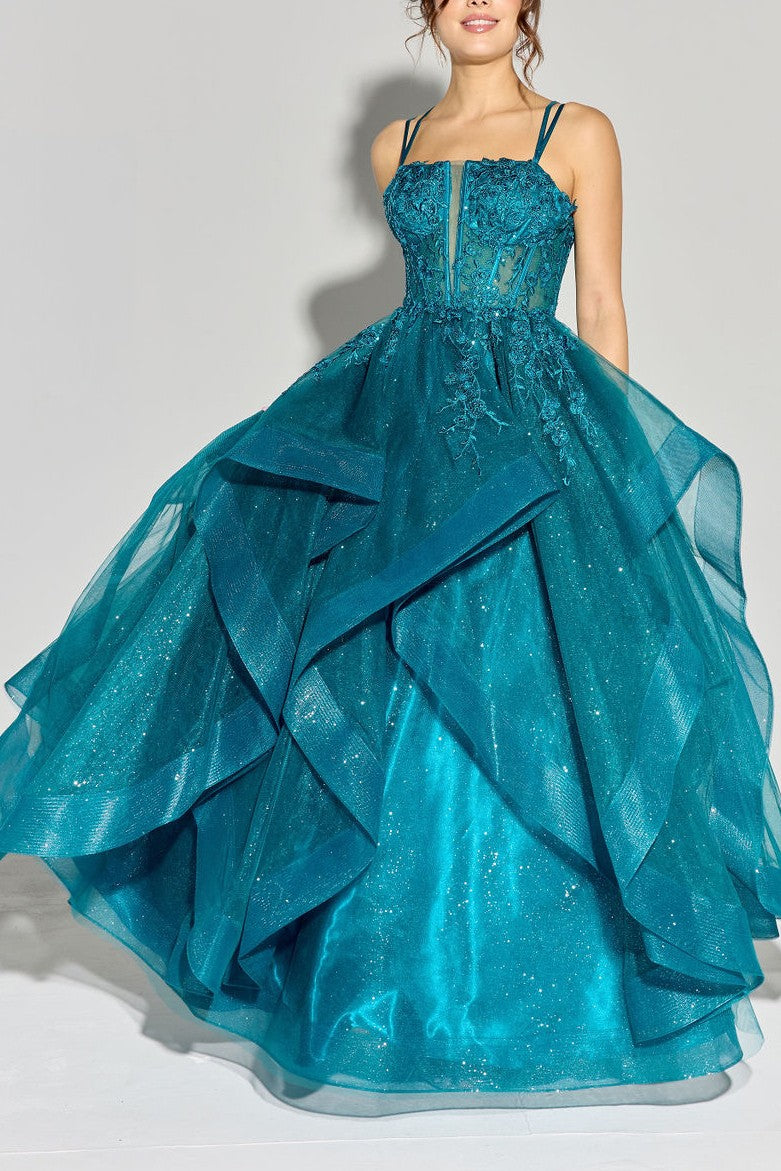 Slip into pure elegance with this show-stopping gown featuring layers of sumptuous tulle that demand attention. Dual straps keep everything secure while the corset back—complete with V-line boning and delicate floral appliques—creates a stunning silhouette. The sheer bodice adds just the right touch of drama, and horsehair-trimmed ruffles give your skirt that jaw-dropping volume and movement you've been dreaming of.