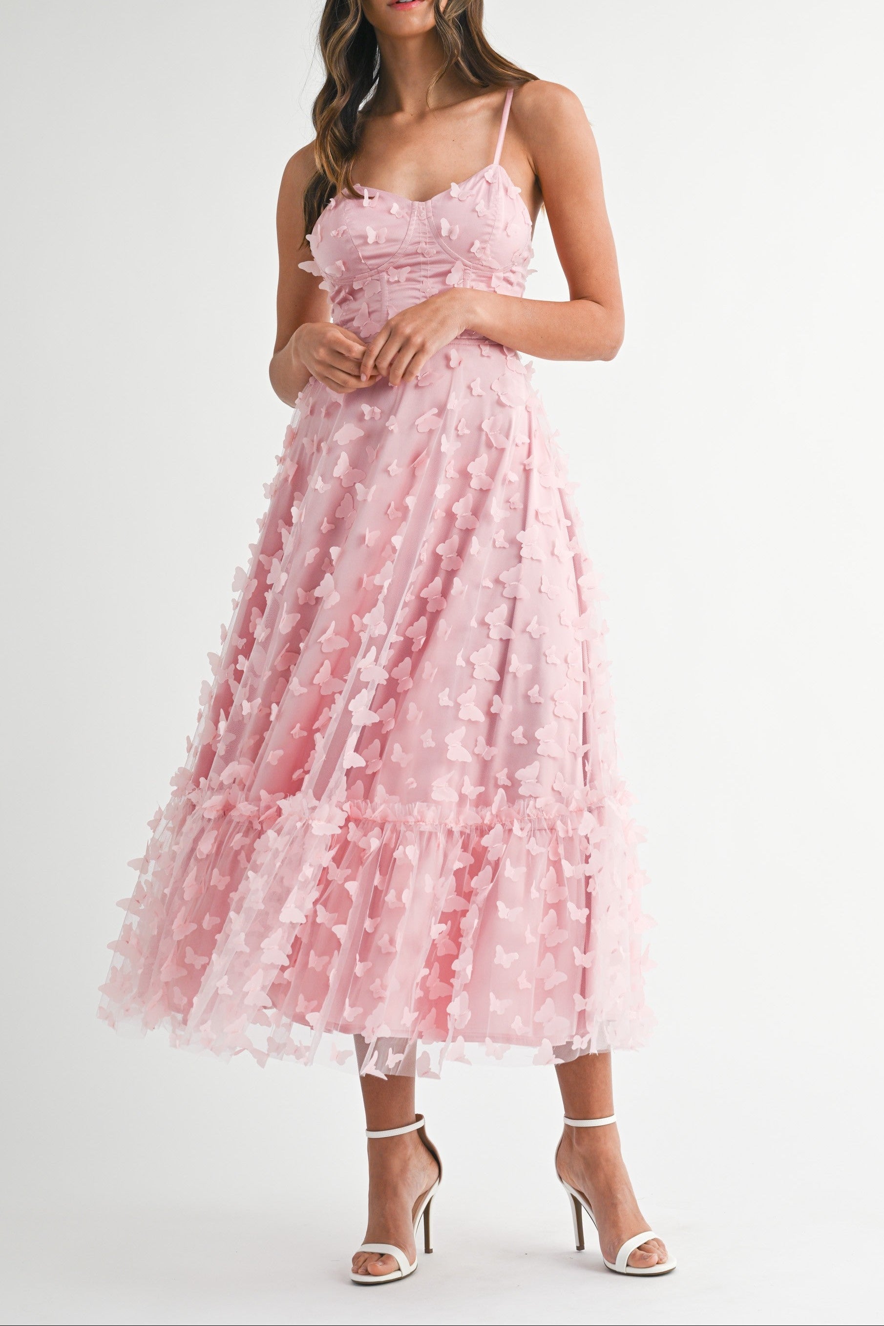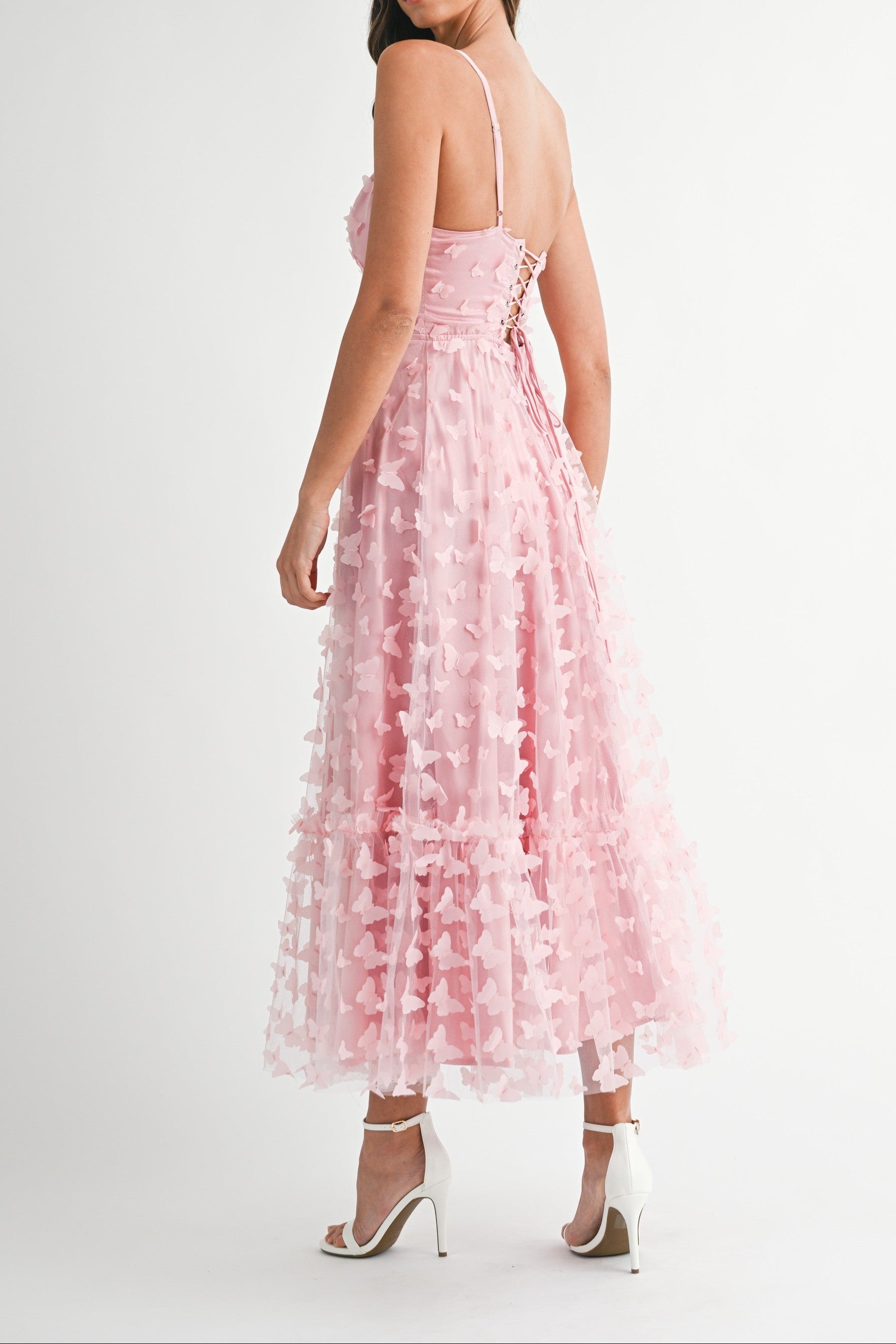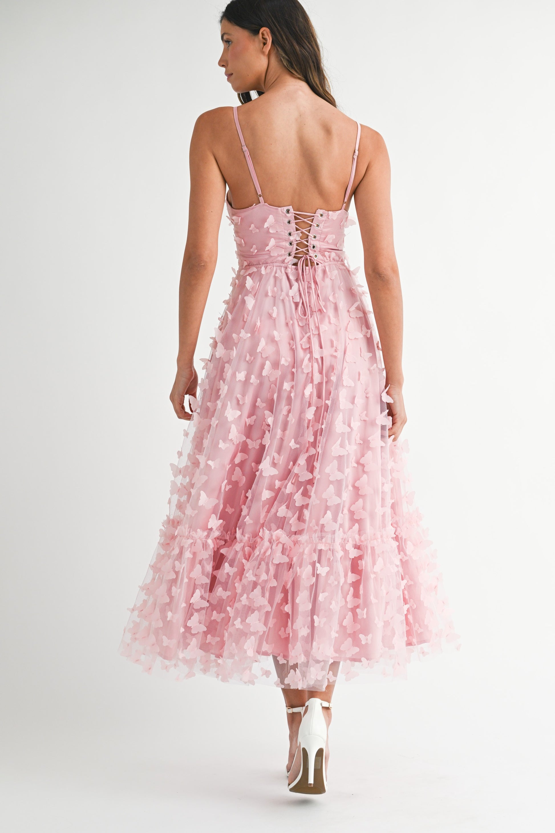 Fluttery mesh detailing meets structured elegance in this lace-up bustier midi. The butterfly-textured back adds whimsical movement, while the corset bodice delivers that coveted hourglass silhouette. Fully lined for comfort and confidence all night long.