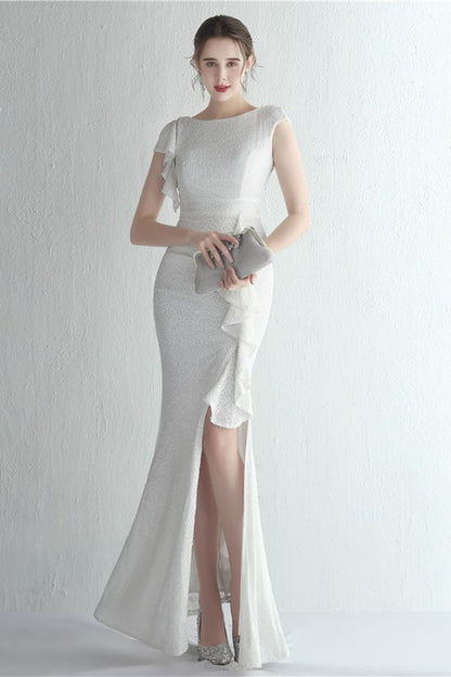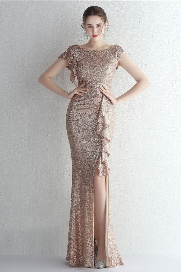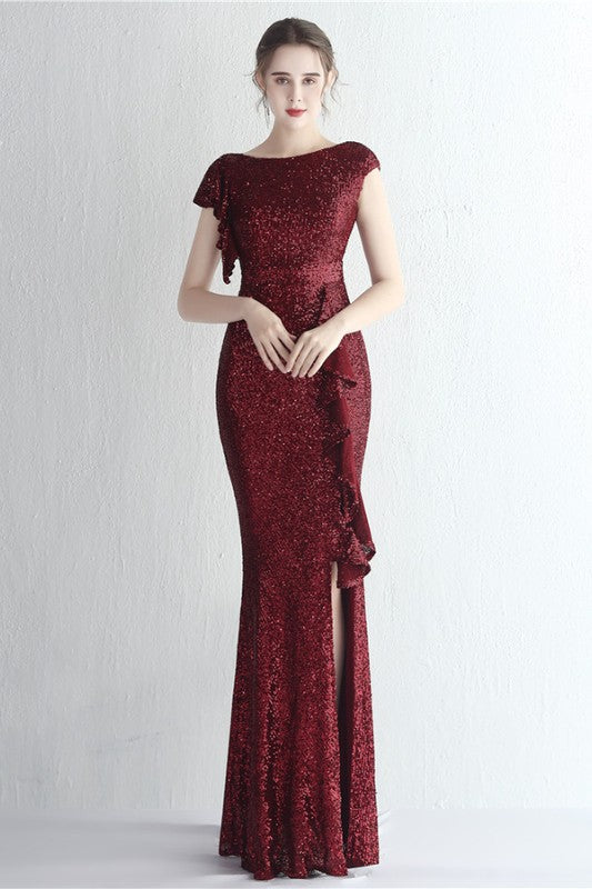 Sparkle all night in this sequin-studded mermaid dress featuring a daring high slit and cute cap sleeves for a touch of modest fun.
