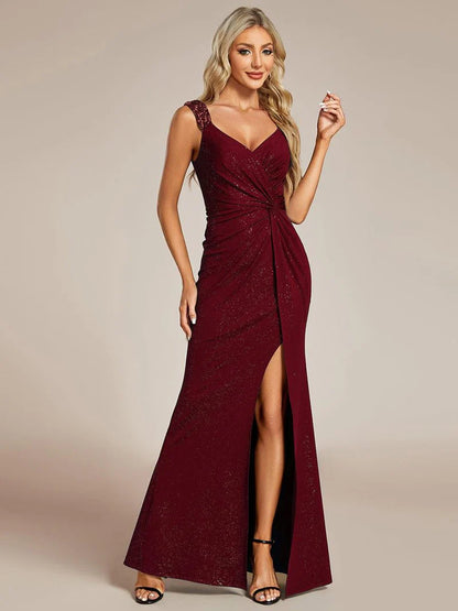 Make a dazzling entrance in this Glitter V-Neck High Slit Sequin Shoulder Strap Evening Dress. The shimmering sequins create a show-stopping look, while the v-neckline and high slit add a touch of sophistication. Whether you're attending a fancy cocktail party, a wedding reception, or a special celebration, this dress will make you the center of attention and leave a lasting impression.