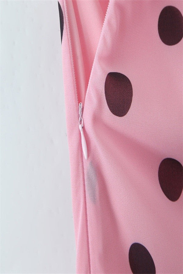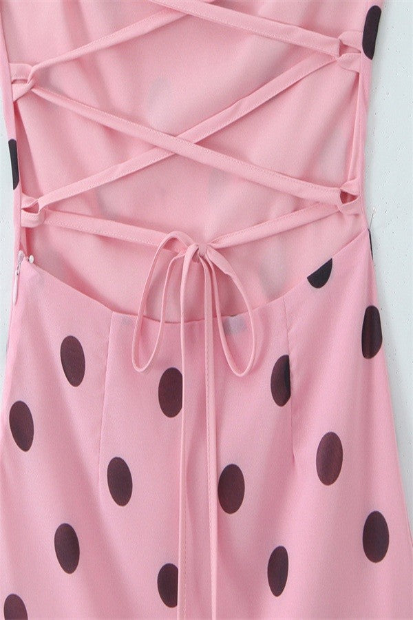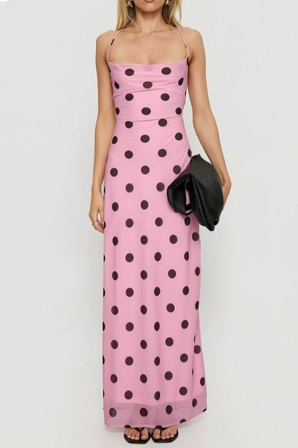 Twirl in timeless style with this charming polka dot slip maxi. The fitted bodice hugs beautifully before flowing into an elegant skirt with a dropped waist for a flattering silhouette. Adjustable tie shoulder straps and a chic criss-cross back detail add just the right amount of personality to this effortlessly sophisticated dress.