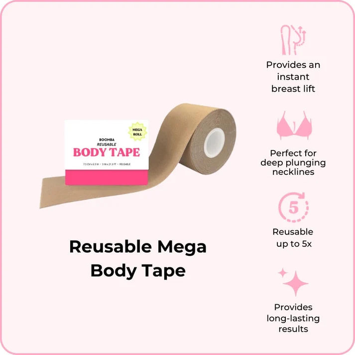 BOOMBA's Reusable Body Tape can be reusable up to five times. Designed to contour with your shapes, our body tape is gentle yet strong, providing long-lasting results for up to 12 hours.
