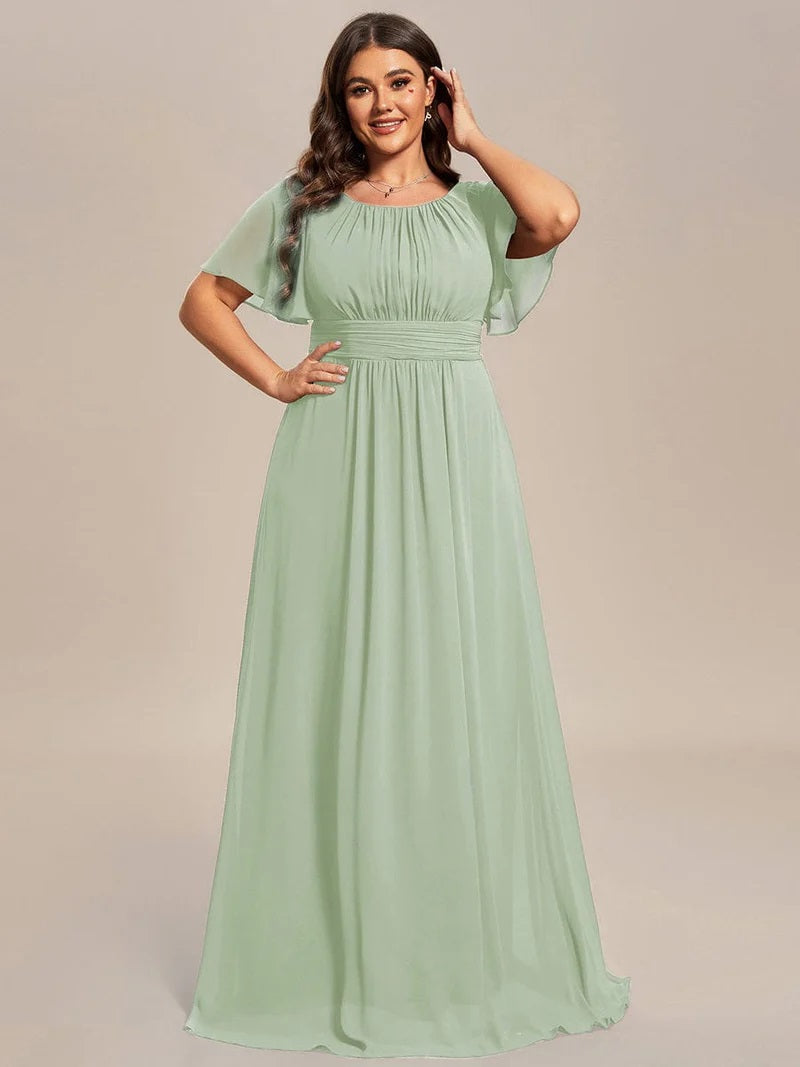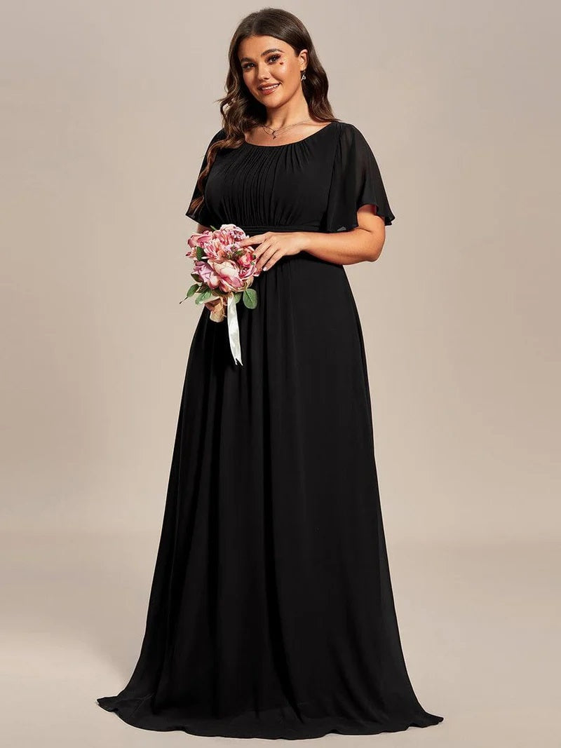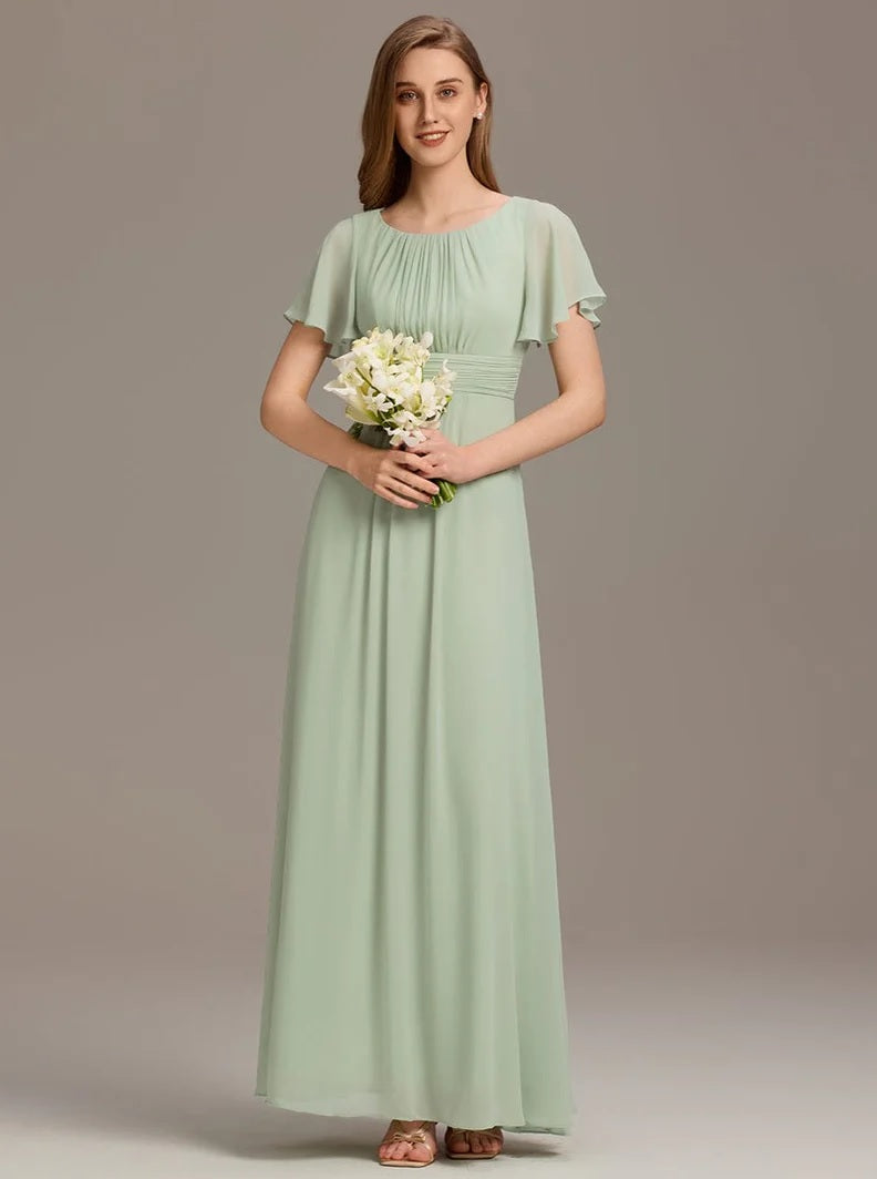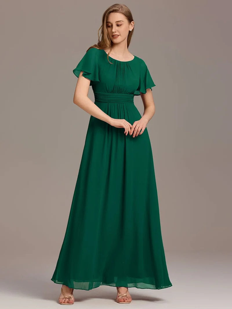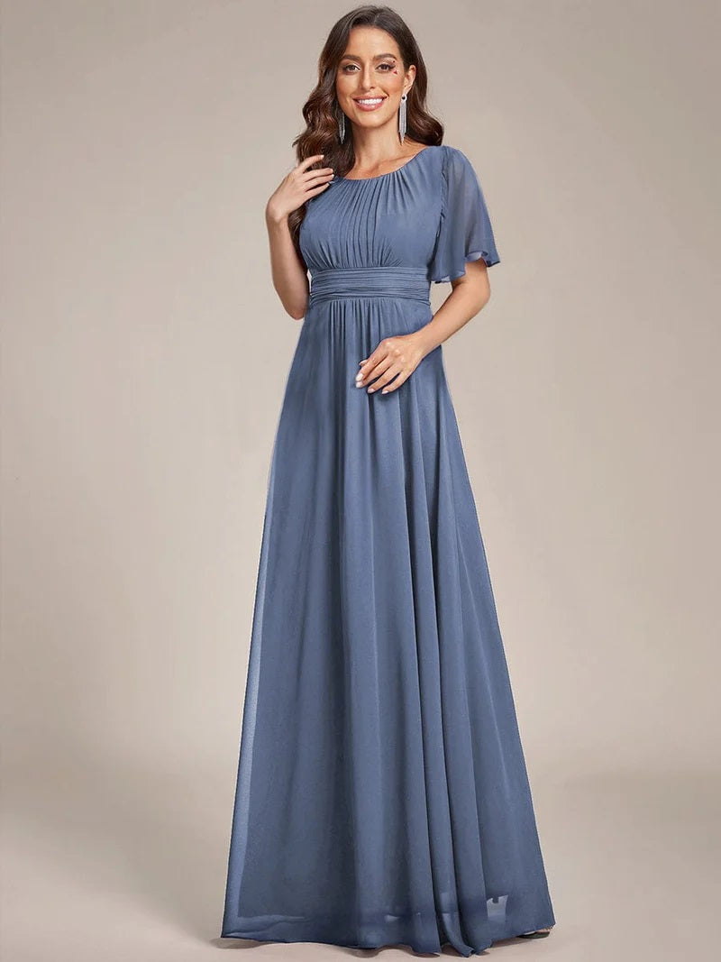 A-line silhouette and pleated chiffon fabric flow gently over curves, creating a stunning and flattering shape for any body type. The round neckline adds an extra touch of class to this timeless design, making it perfect for any formal occasion. Crafted from chiffon fabric, this dress feels light and airy on your skin, making it breathable and comfortable to wear all day and night.
