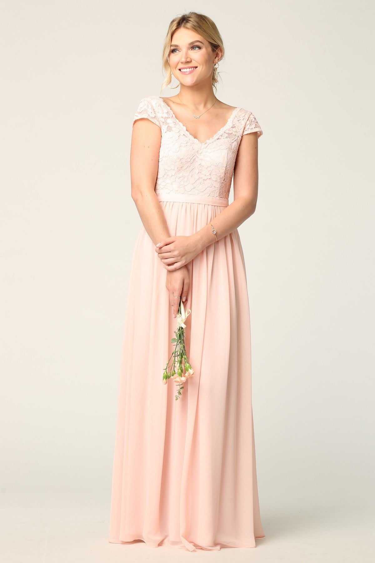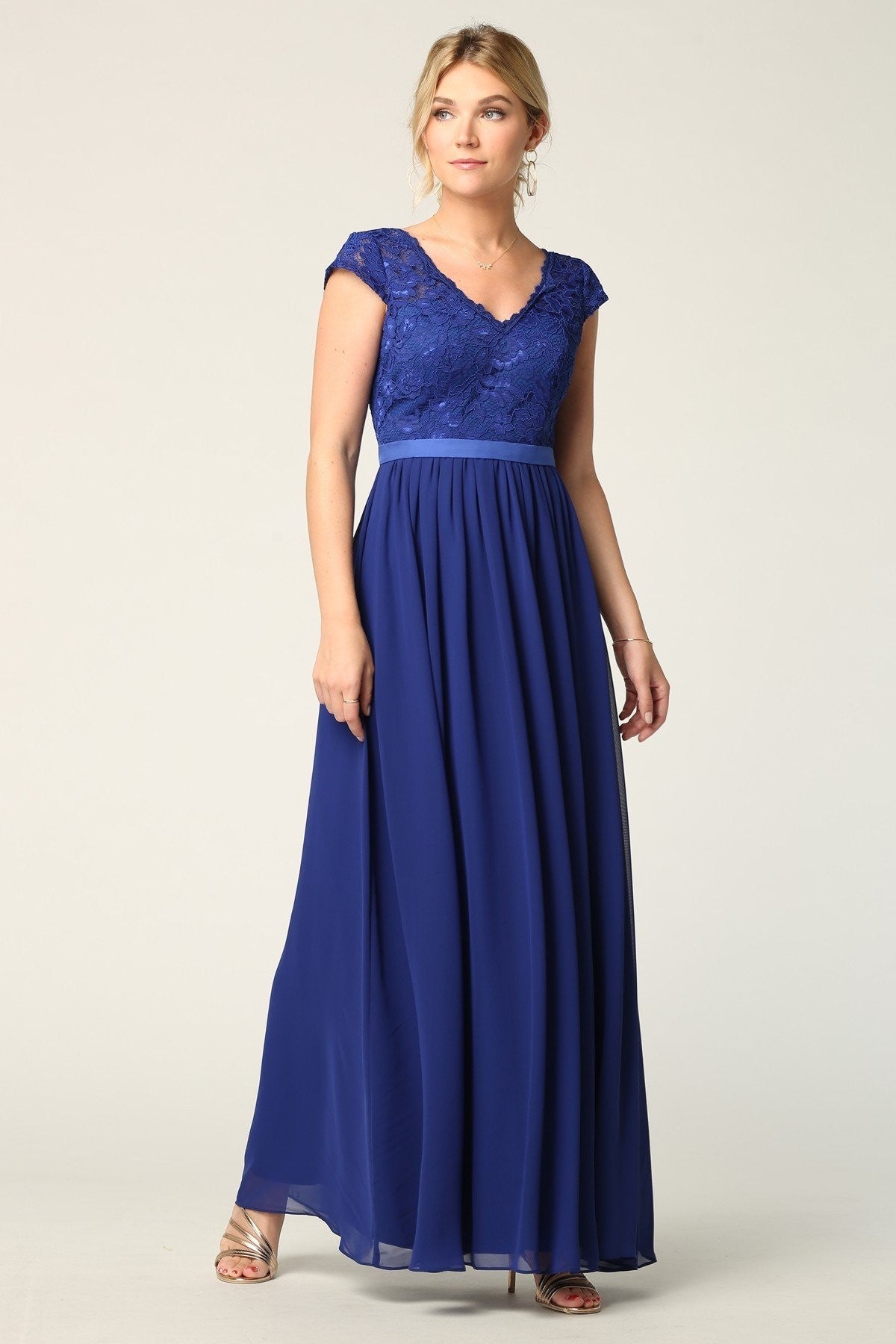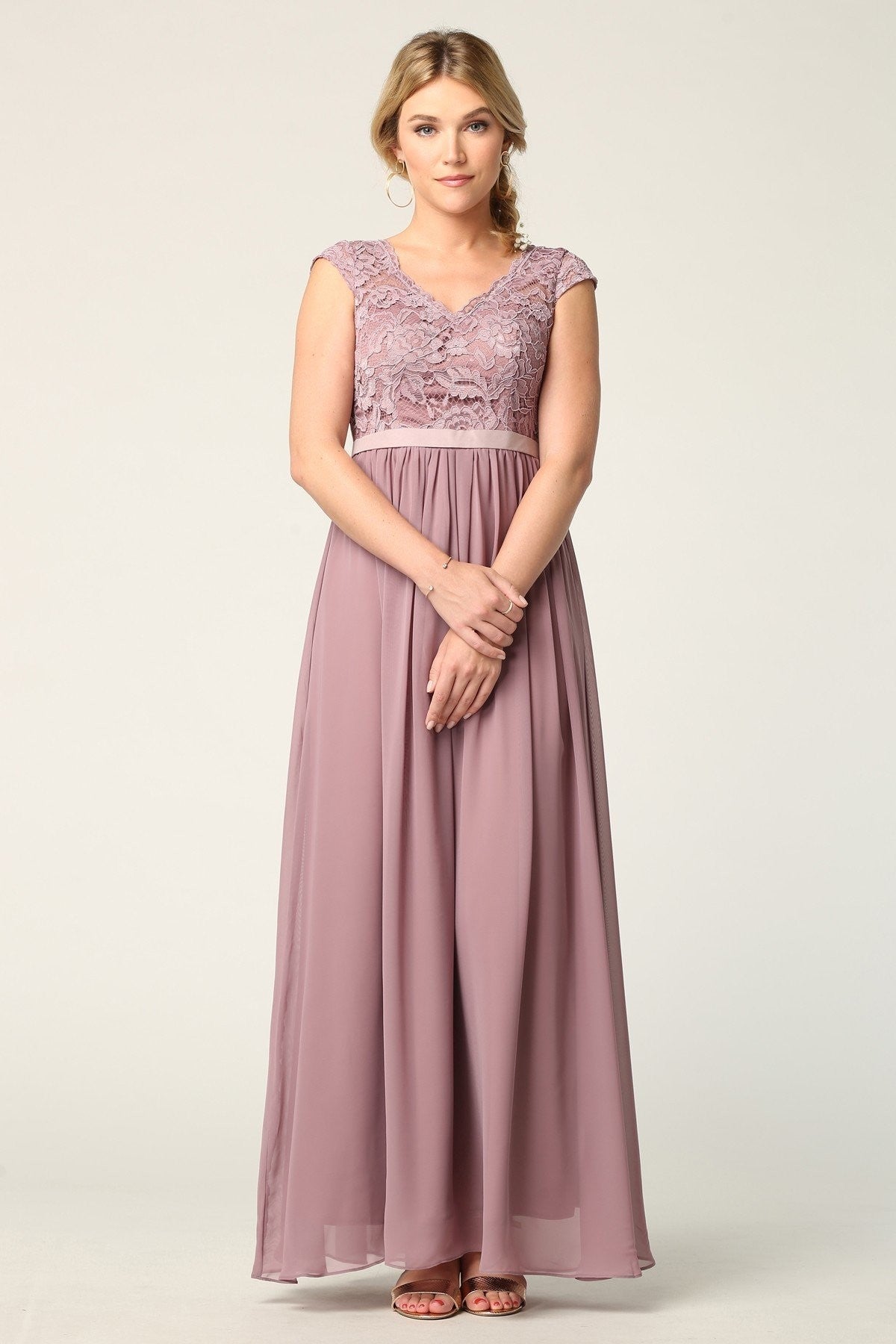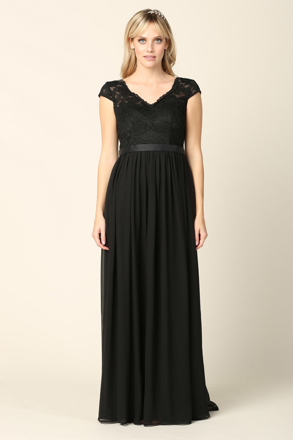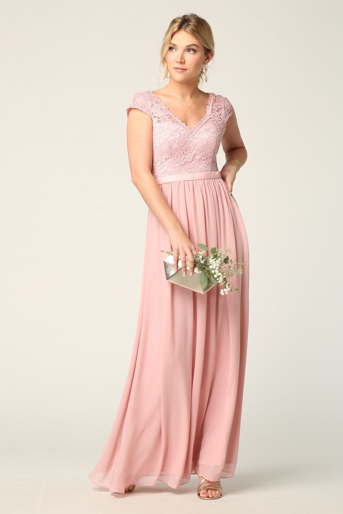 Slip into elegance with this floor-sweeping gown that's as fun to wear as it is stunning to see. The delicate lace bodice pairs beautifully with a silky satin belt and flowing chiffon skirt, while charming cap sleeves and a scalloped neckline add just the right touch of romance. A convenient back zip makes getting ready effortless, and the fully lined construction with built-in bra cups ensures you feel supported and confident all night long.