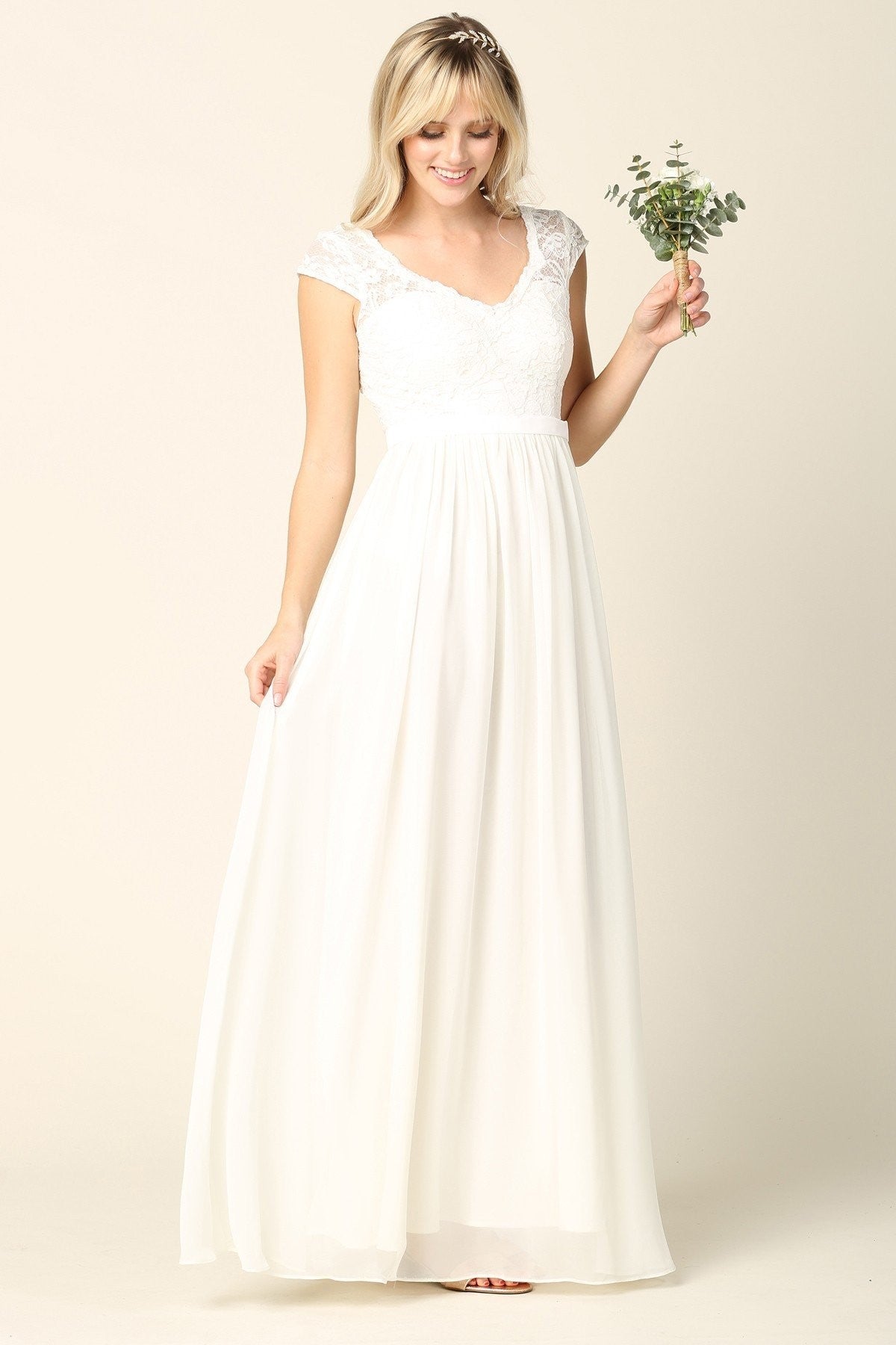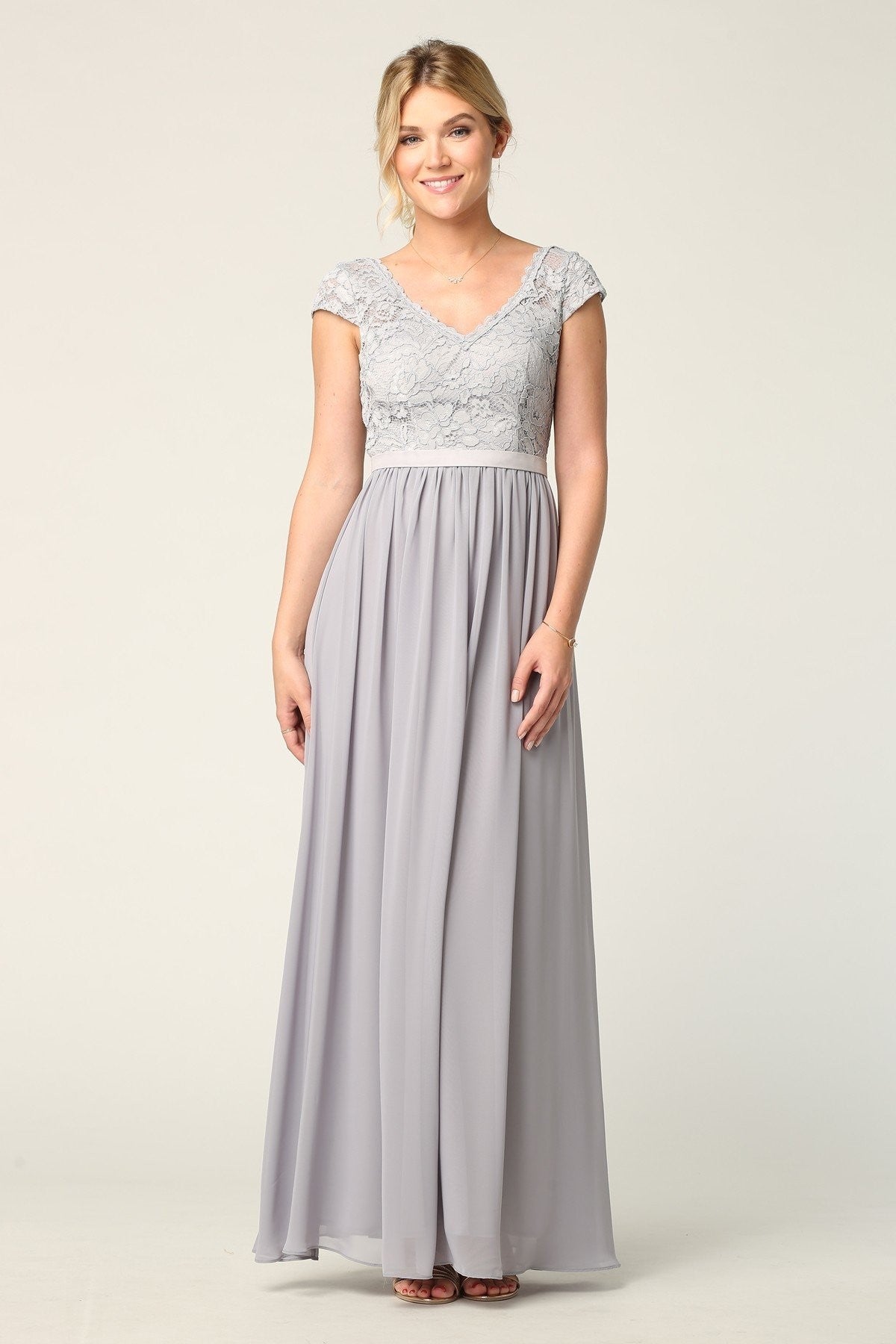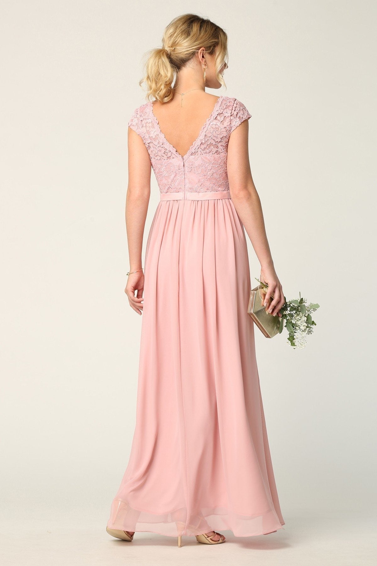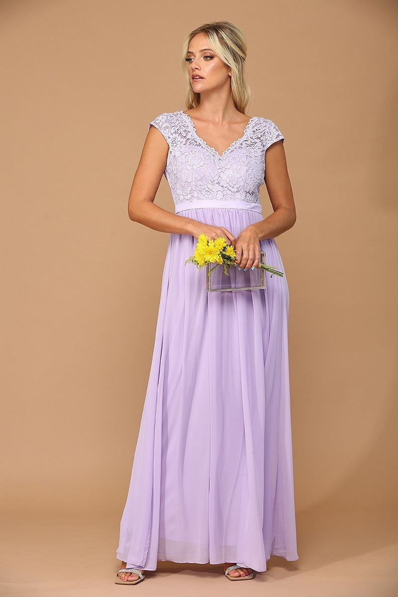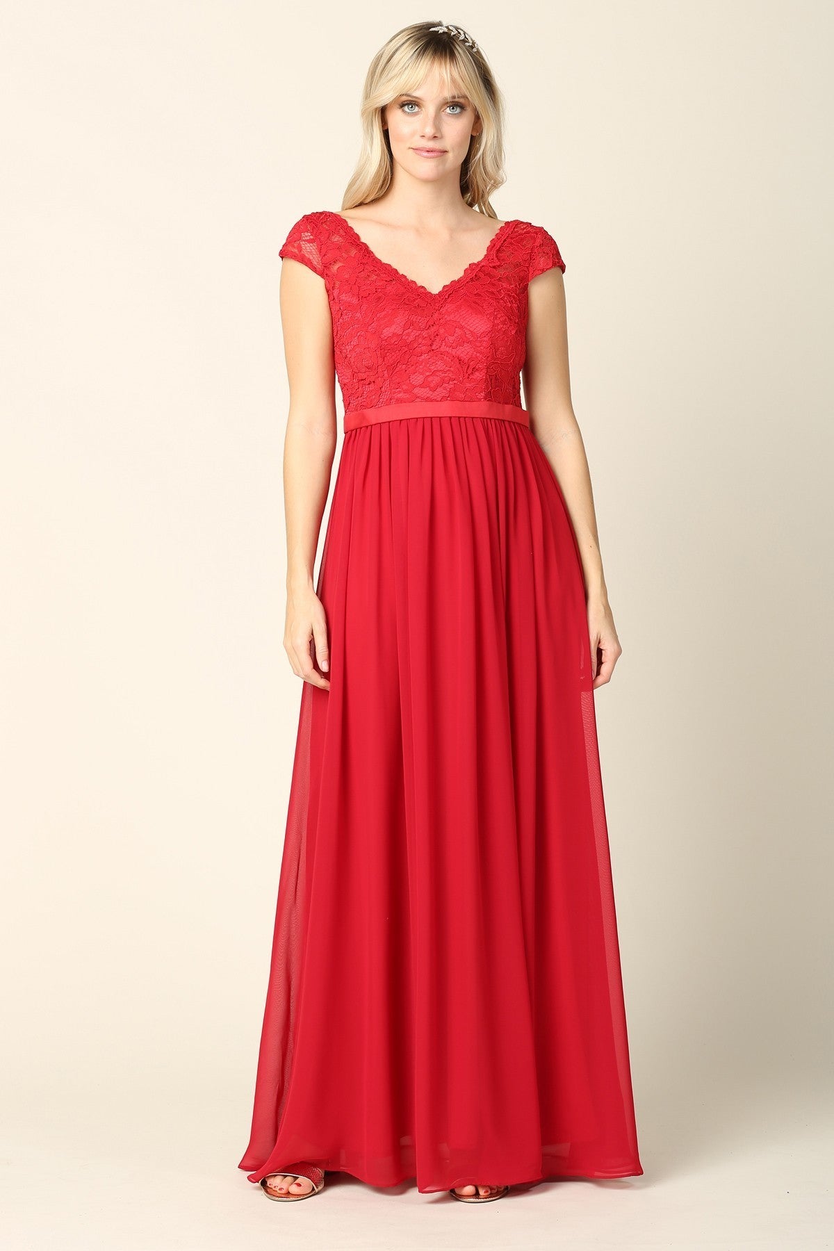 Slip into elegance with this floor-sweeping gown that's as fun to wear as it is stunning to see. The delicate lace bodice pairs beautifully with a silky satin belt and flowing chiffon skirt, while charming cap sleeves and a scalloped neckline add just the right touch of romance. A convenient back zip makes getting ready effortless, and the fully lined construction with built-in bra cups ensures you feel supported and confident all night long.
