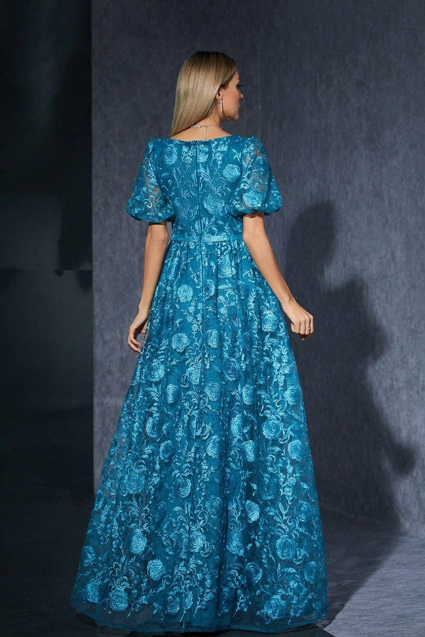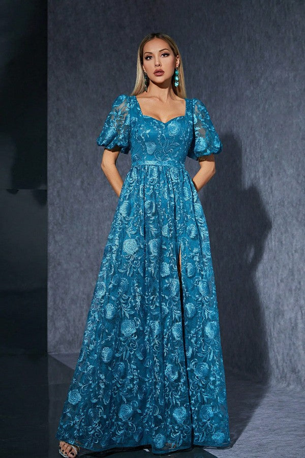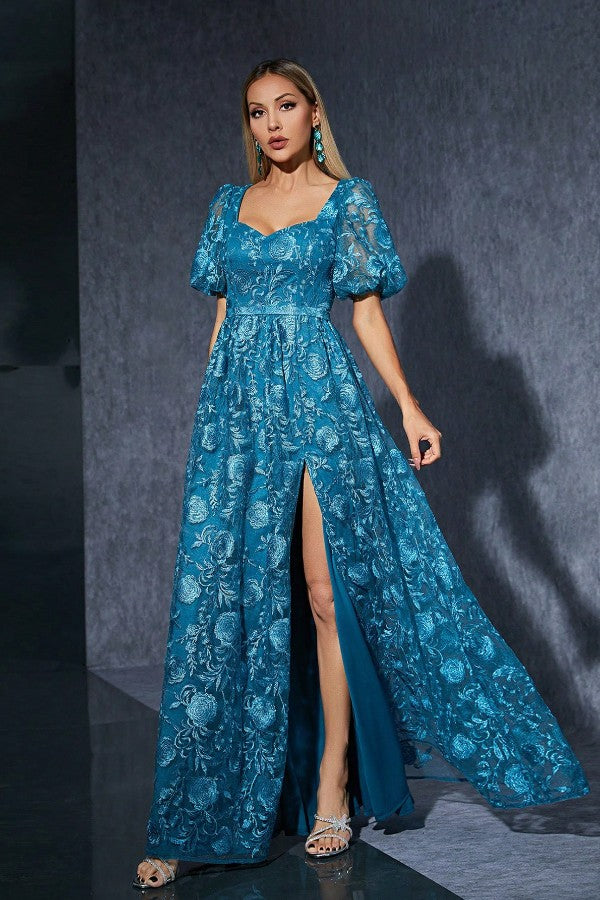 Twirl into the spotlight in this charming blue gown, complete with romantic puff sleeves and a flirty slit. Perfect for birthday celebrations, special photoshoots, or any moment that calls for a touch of sweetness and style.