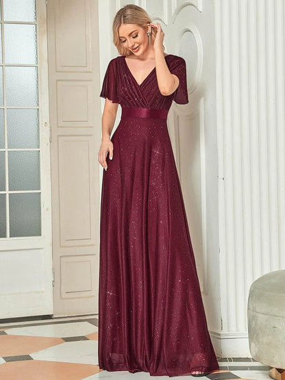 Shiny and sophisticated, indulge in this stunning A-line evening dress for your next special formal event. Short flutter sleeves and a plunging ruched v-neck exude elegance, along with a classic A-line silhouette. A luxe ribbon waist and sheer fabric overlay add a magical moment. Pair this floor-length evening dress with heels or flats and your favorite jewelry at evening party, prom or any special occasion.