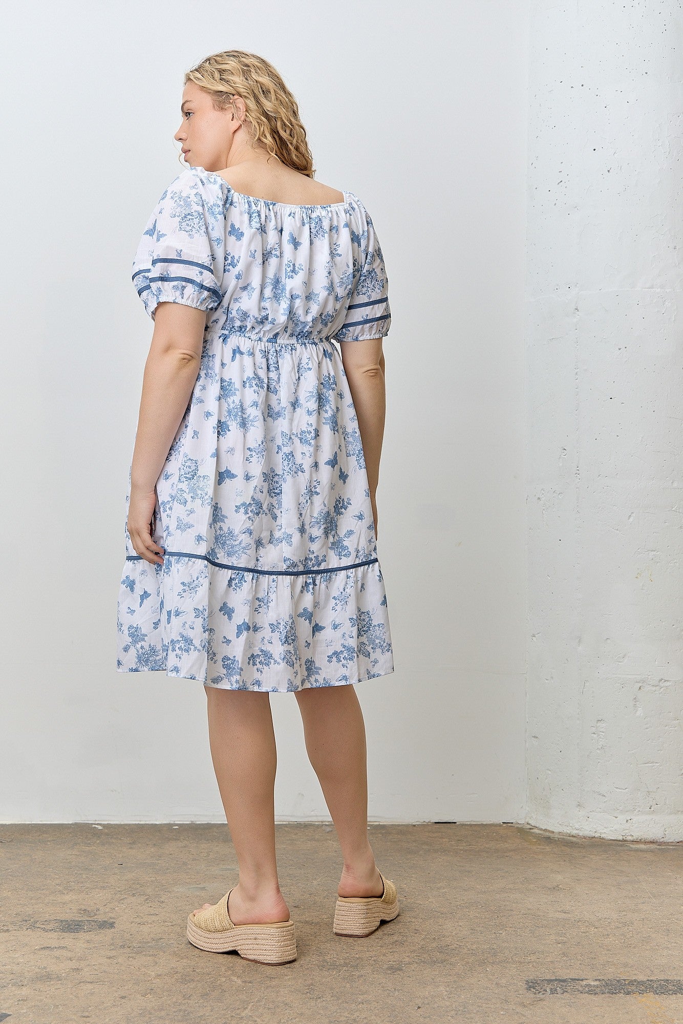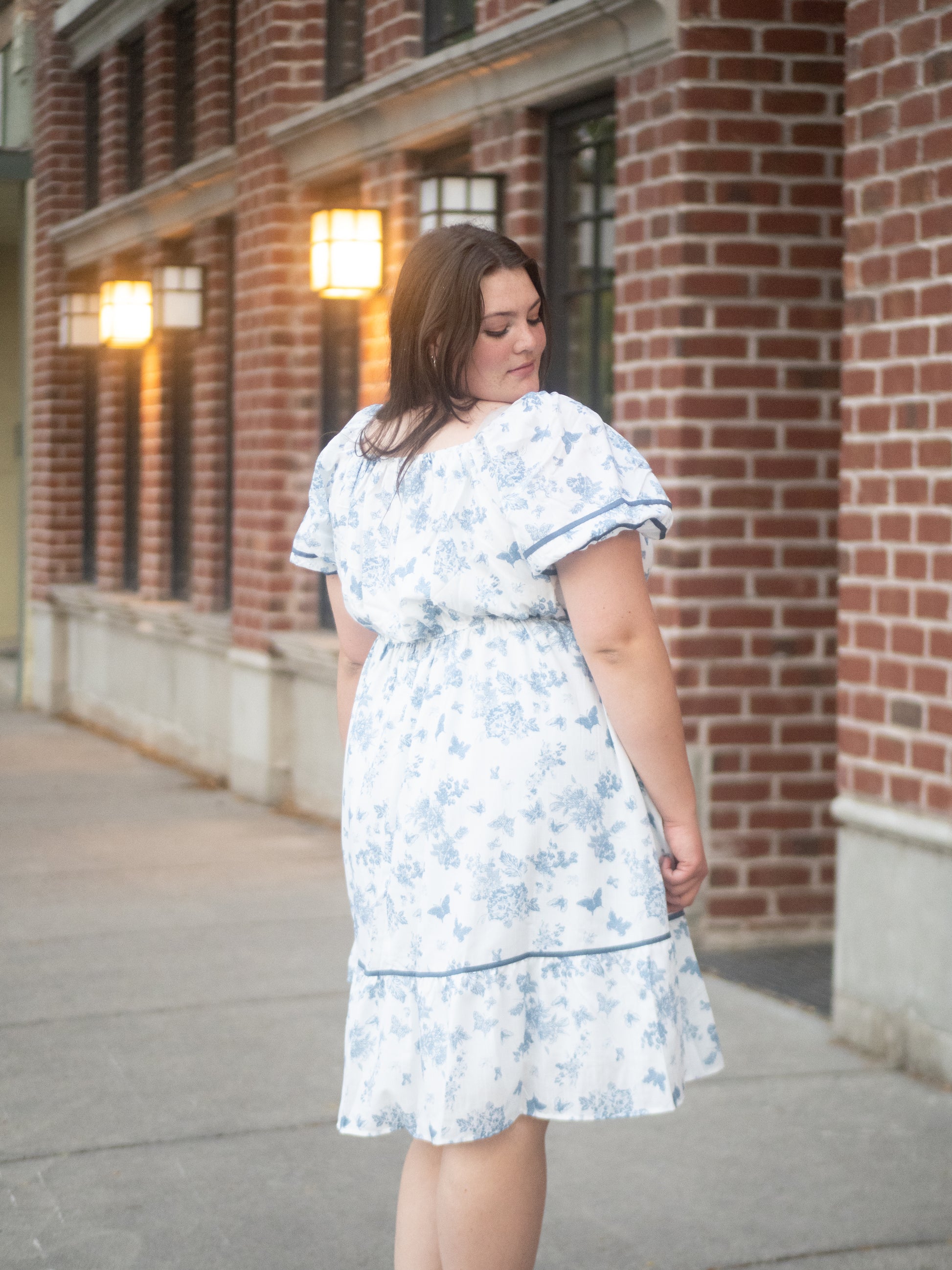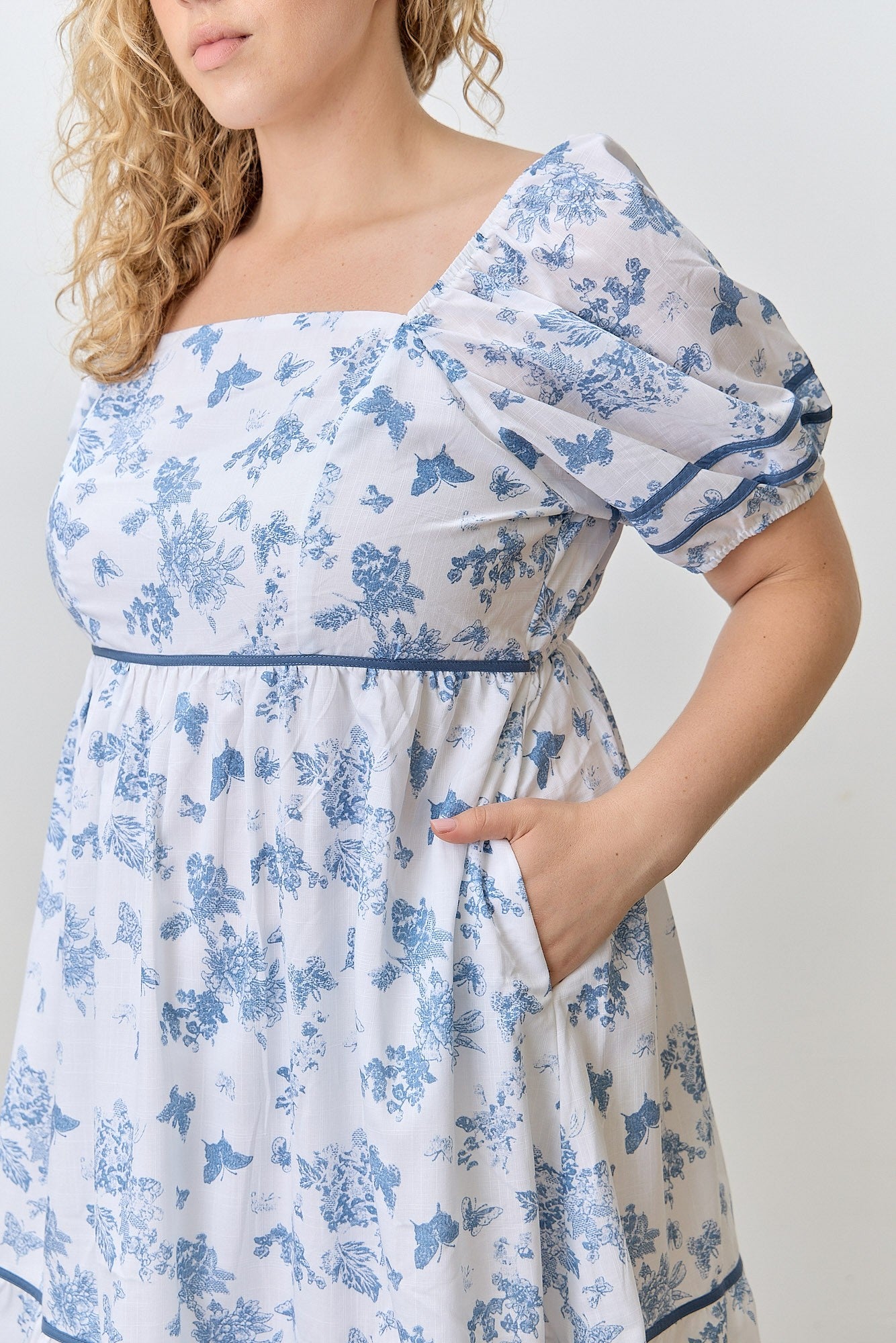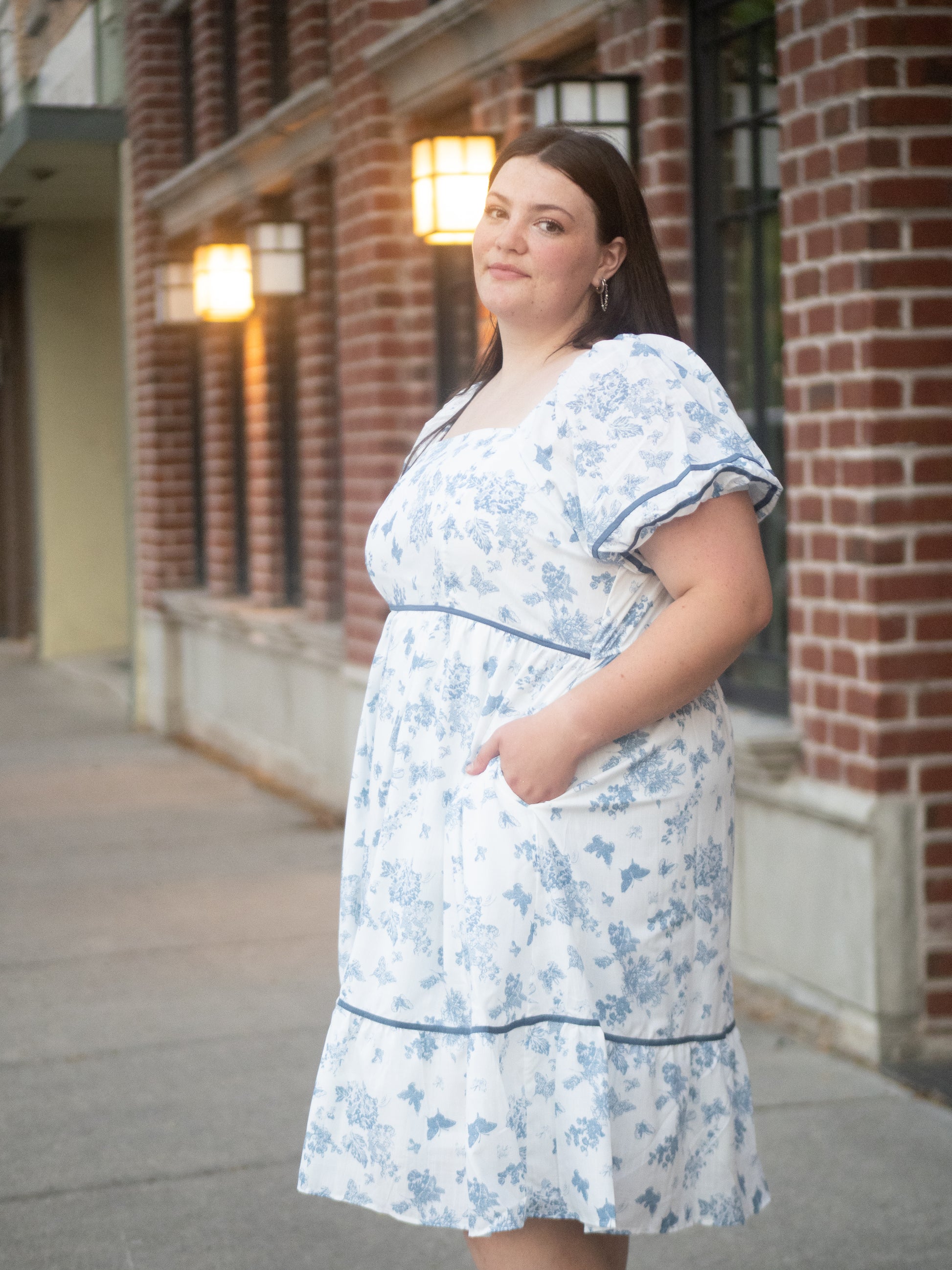 Featuring short bubble sleeves and playful tape accents, this piece shines with a chic square neckline, a flirty ruffle hem, and handy side pockets for your essentials—all while keeping it modest and fun.