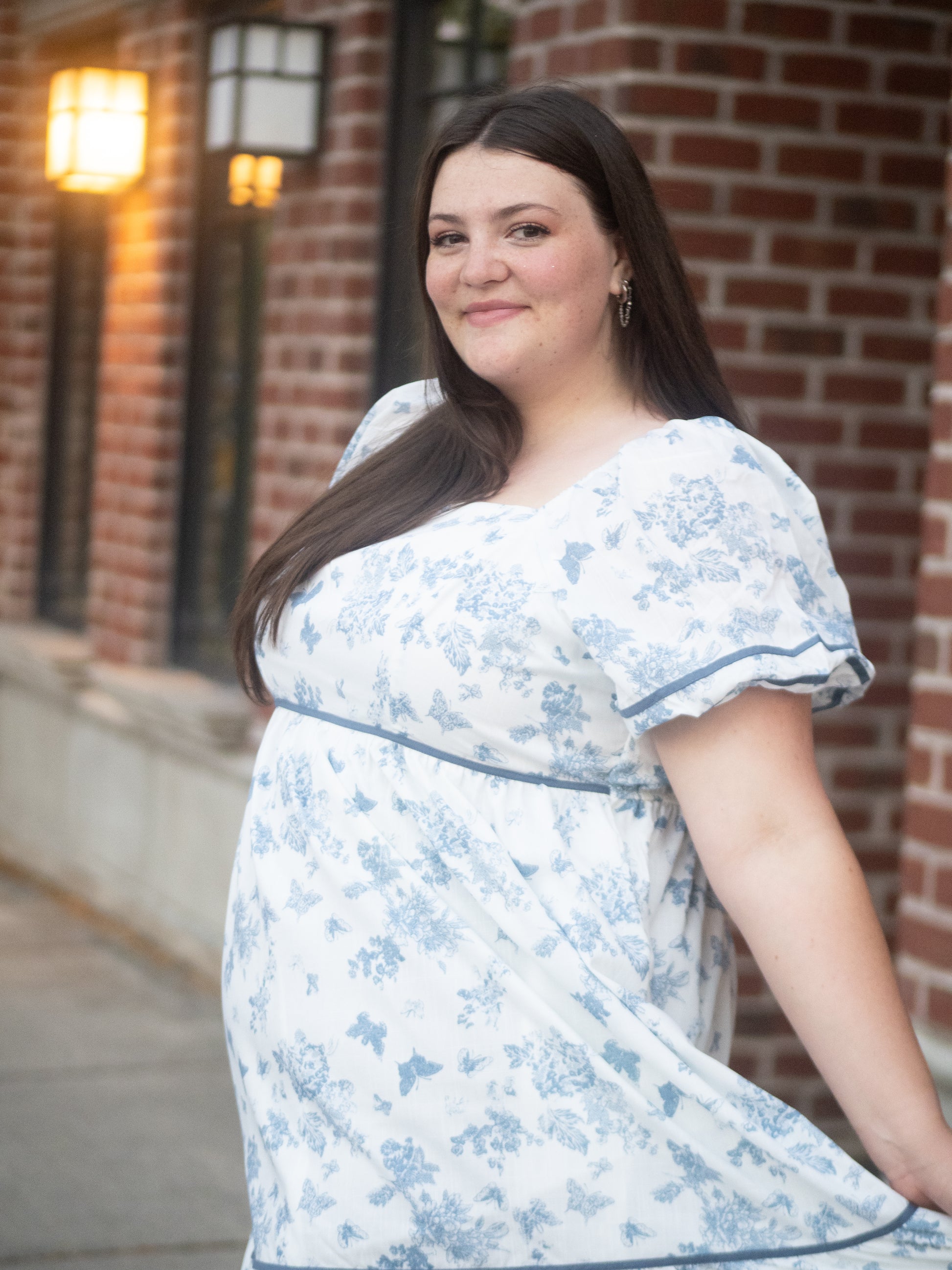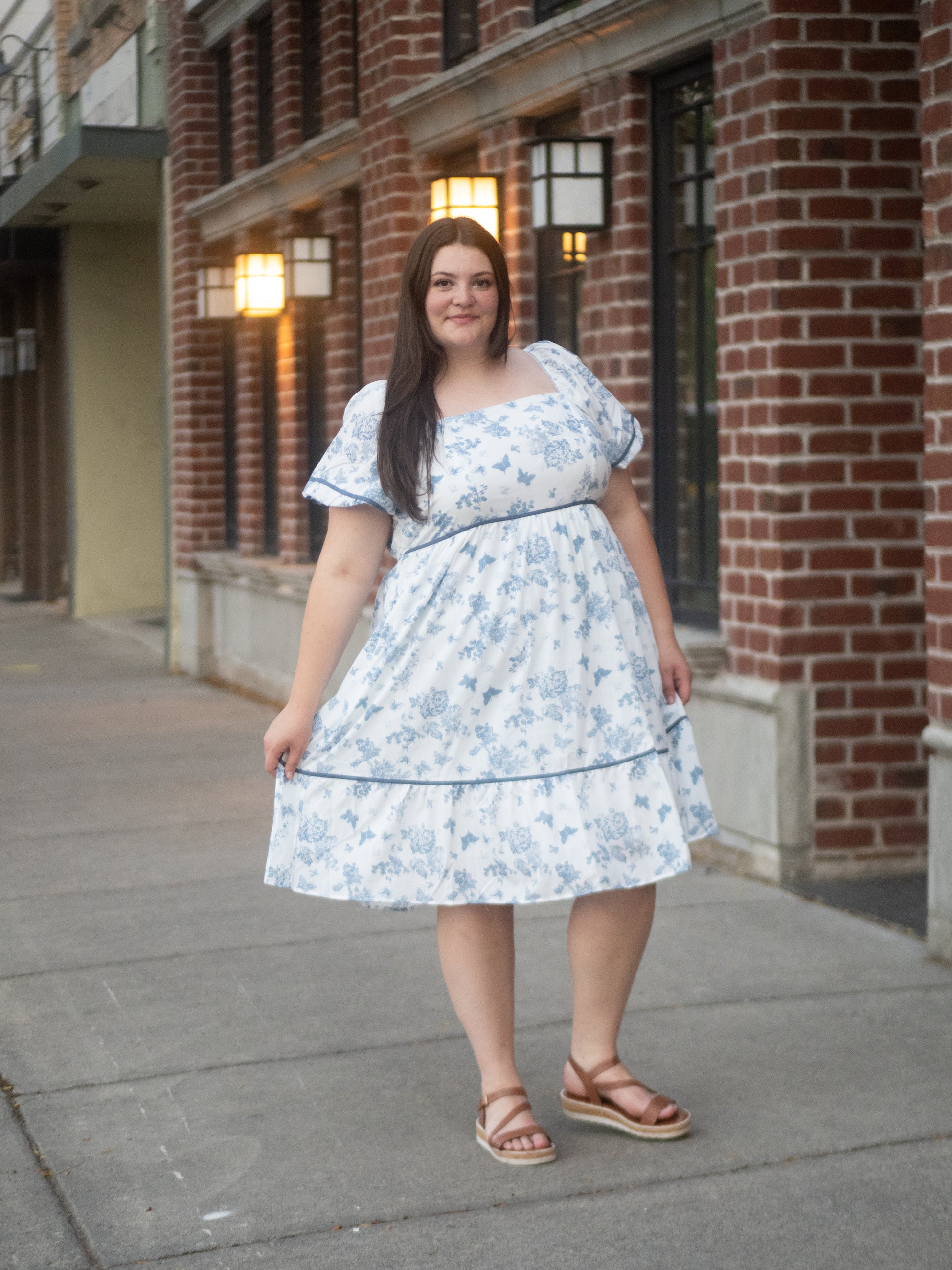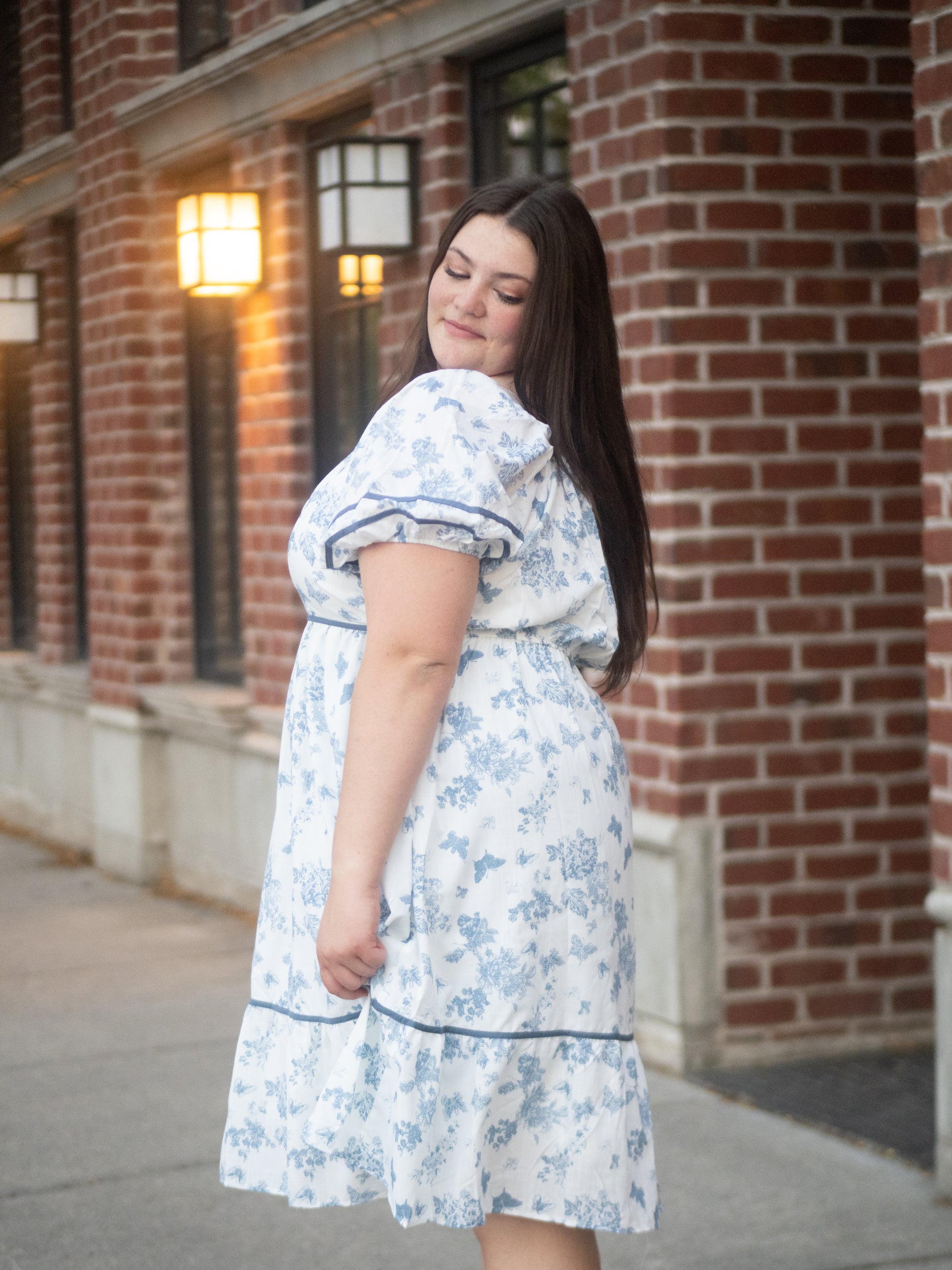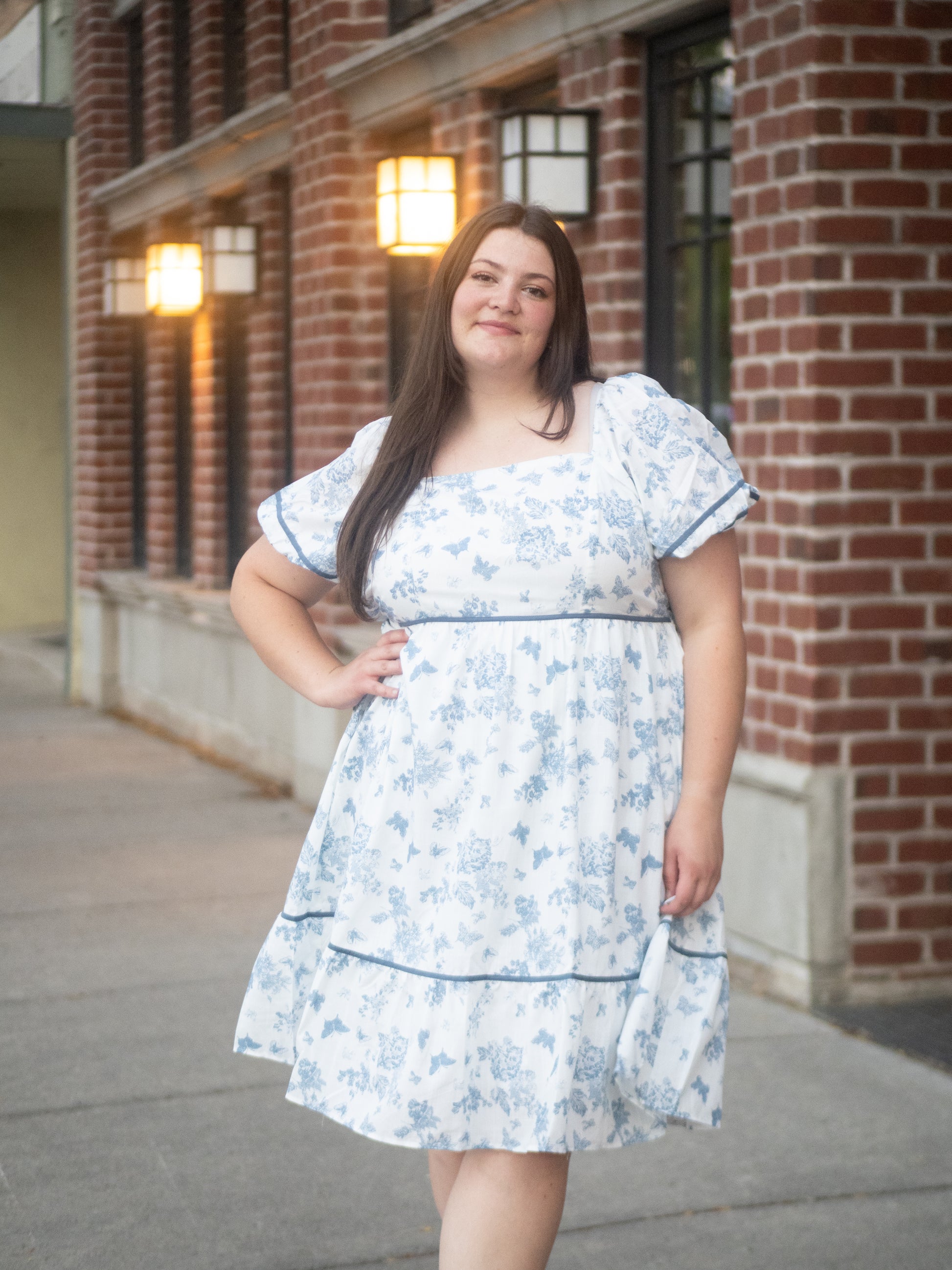 Featuring short bubble sleeves and playful tape accents, this piece shines with a chic square neckline, a flirty ruffle hem, and handy side pockets for your essentials—all while keeping it modest and fun.